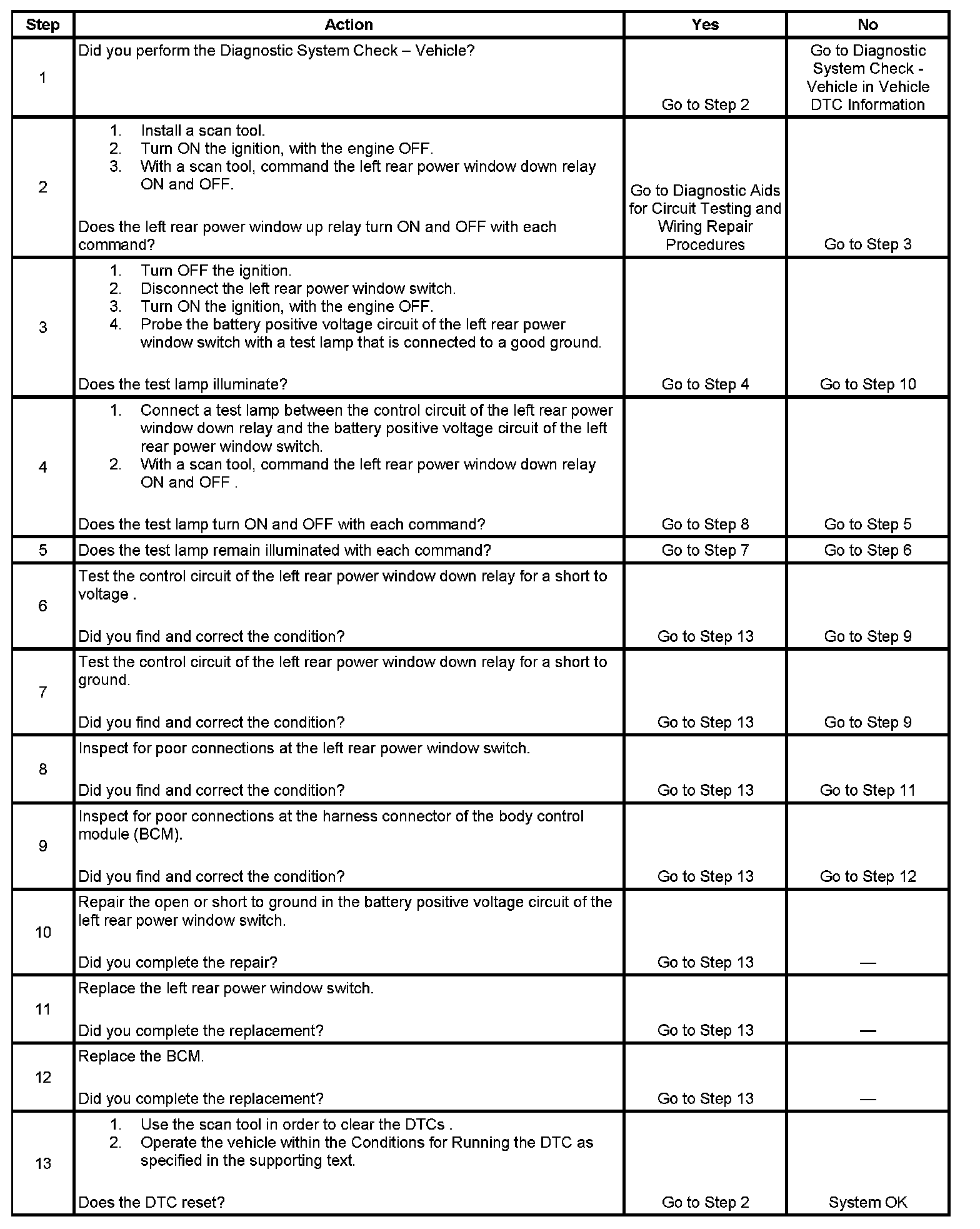 - When the BCM has grounded the left rear power window down relay control circuit and the control circuit is shorted to battery positive voltage.