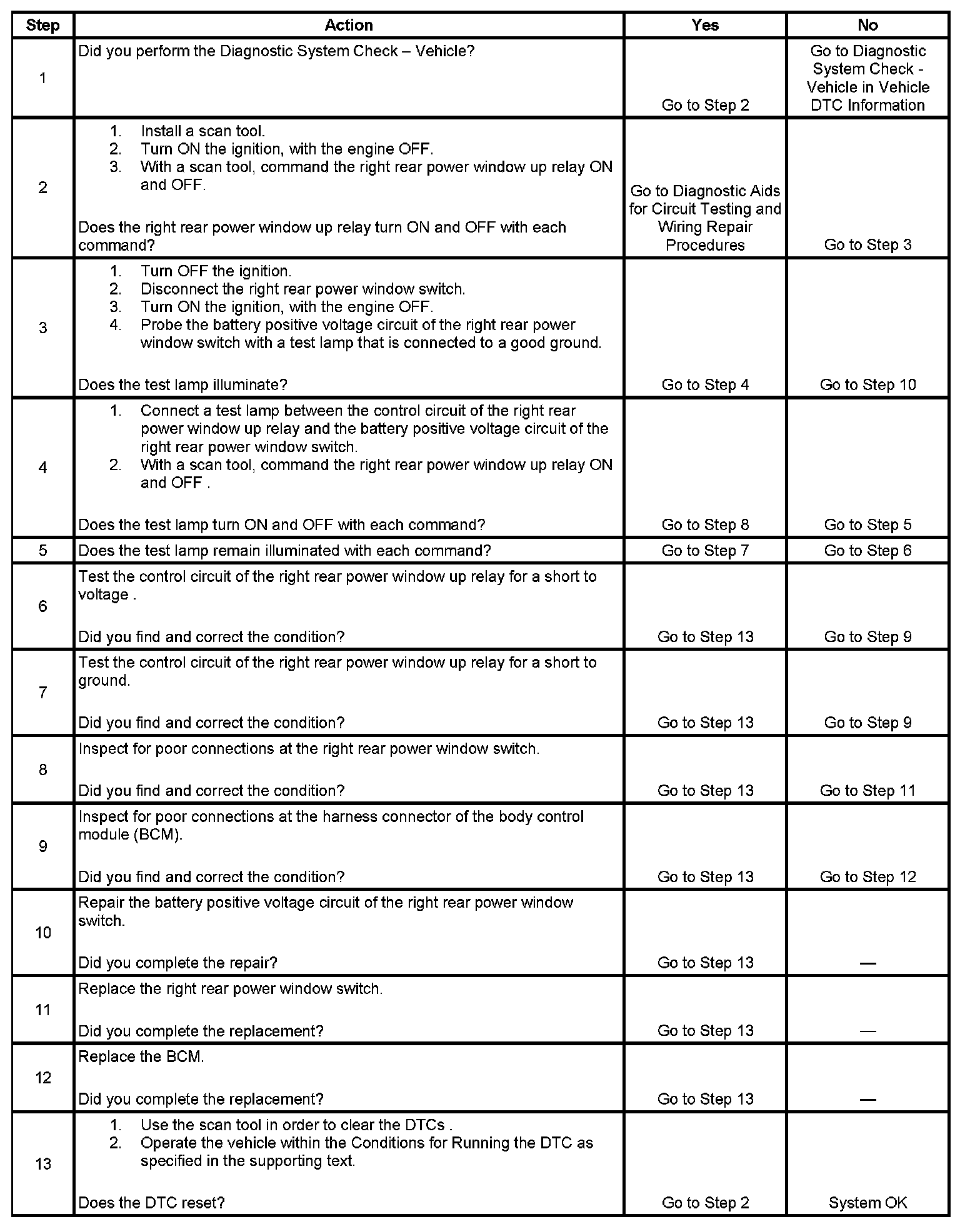 - When the BCM has grounded the right rear power window up relay control circuit and the control circuit is shorted to battery positive voltage.