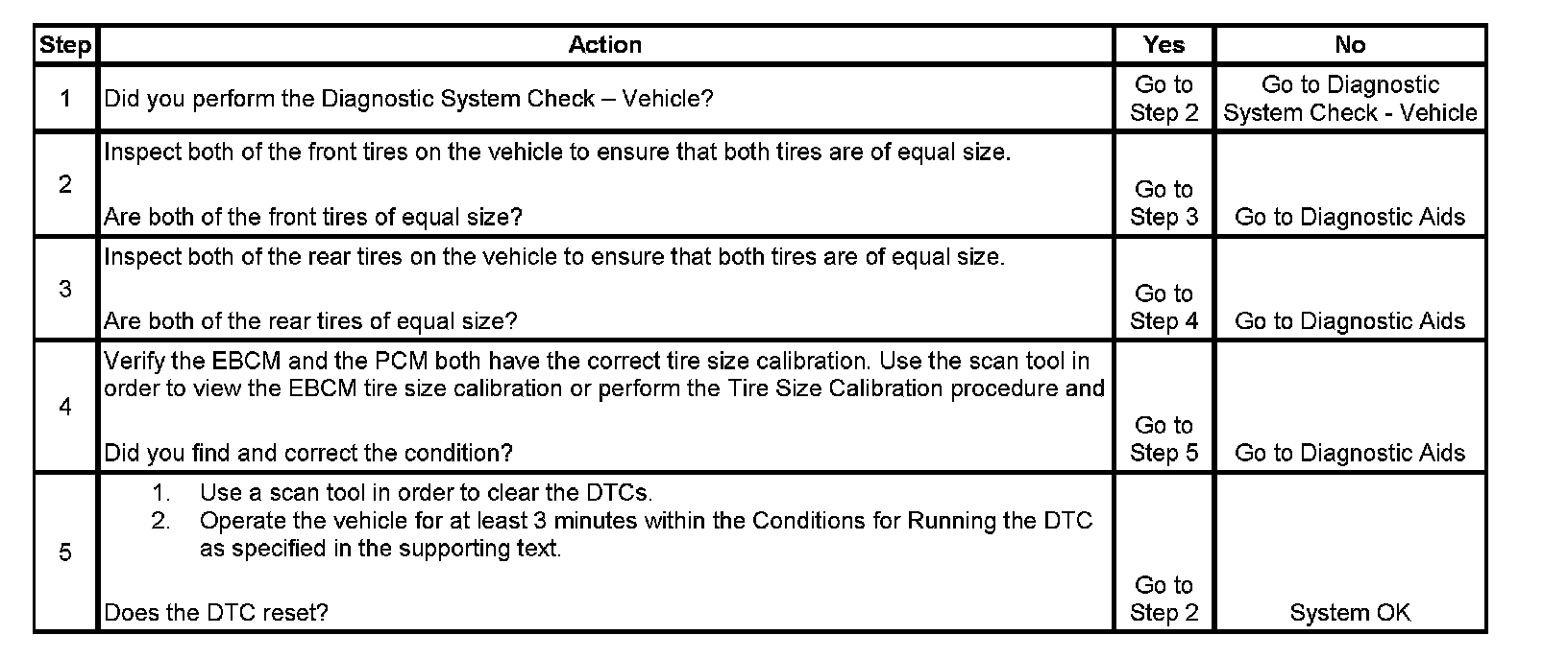 Installing one tire of significantly different size on the vehicle causes this DTC to set. Operating the vehicle with a tire that has very low air pressure may also set this DTC. Inspect the vehicle for an incorrect or damaged wheel speed sensor or vehicle speed sensor if the tires and the EBCM and PCM calibrations are OK.