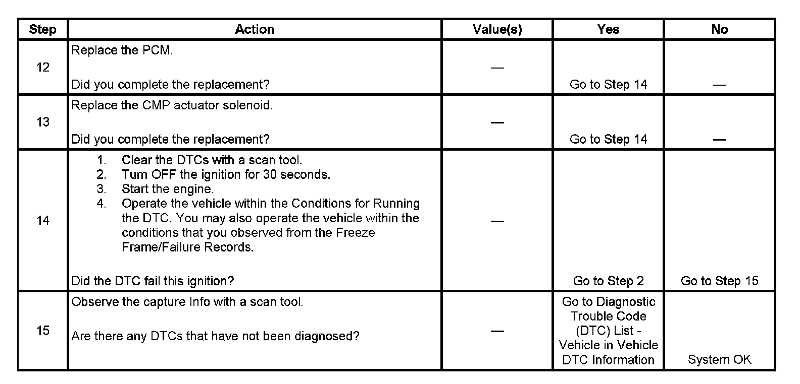 The camshaft position (CMP) actuator is controlled by the powertrain control module (PCM) through a high control circuit and a low reference circuit. The high control circuit carries a 12-volt pulse width modulated (PWM) signal from the PCM to the CMP actuator solenoid in order to control the amount of engine oil flow to the cam phaser. The low reference circuit is used as a return circuit. The PCM has the ability to monitor the functionality of the high control and the low reference circuit. If the PCM detects an open, short to ground, or a short to voltage, DTC P0013 sets.