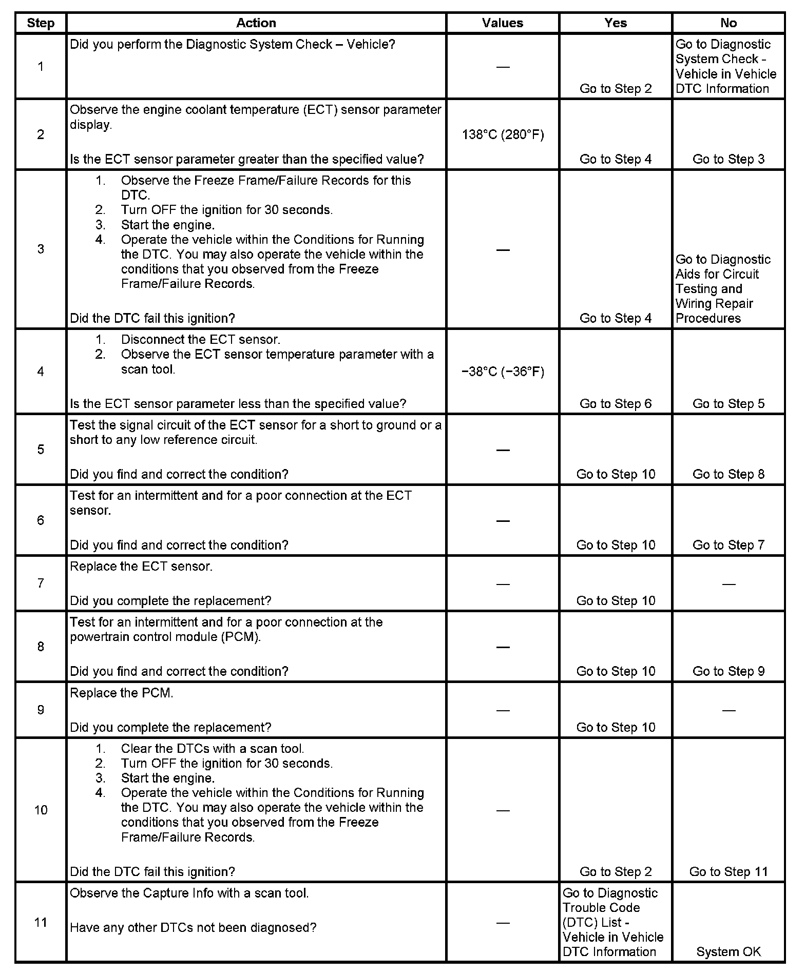 The engine coolant temperature (ECT) sensor is a variable resistor, that measures the temperature of the engine coolant. The powertrain control module (PCM) supplies 5 volts to the ECT signal circuit and a ground for the ECT low reference circuit. When the ECT is cold, the sensor resistance is high. When the ECT increases, the sensor resistance decreases. With high sensor resistance, the PCM detects a high voltage on the ECT signal circuit. With lower sensor resistance, the PCM detects a lower voltage on the ECT signal circuit. If the PCM detects an excessively low ECT signal voltage, which is a high temperature indication, DTC P0117 sets.