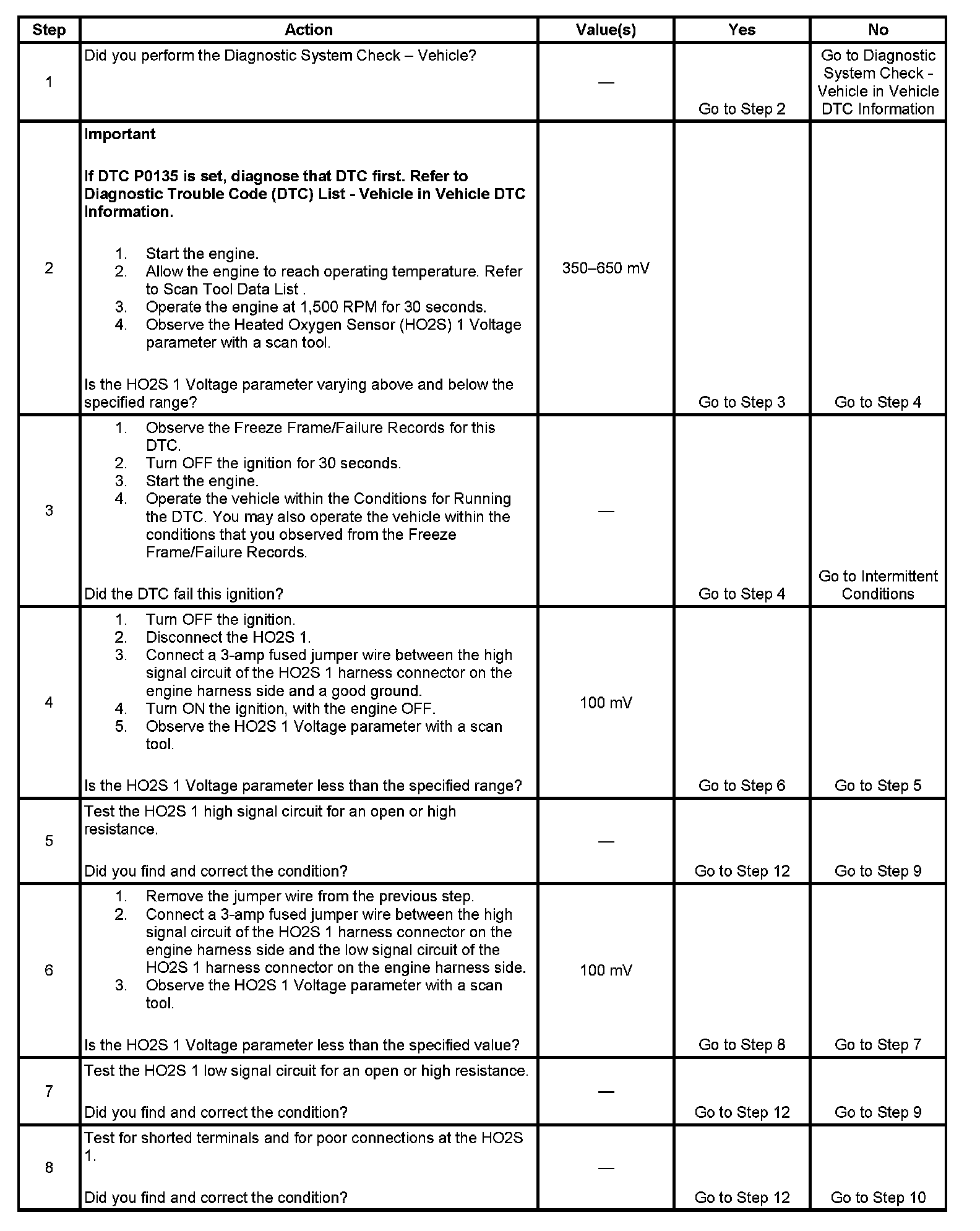 This diagnostic will only run once per ignition cycle. The PCM monitors the rich-to-lean and lean-to-rich transition time. A transition is defined as the HO2S voltage changes from above 500 mV to below 250 mV or from below 250 mV to above 500 mV. If the PCM detects that the transition time is too long, DTC P0133 will set.