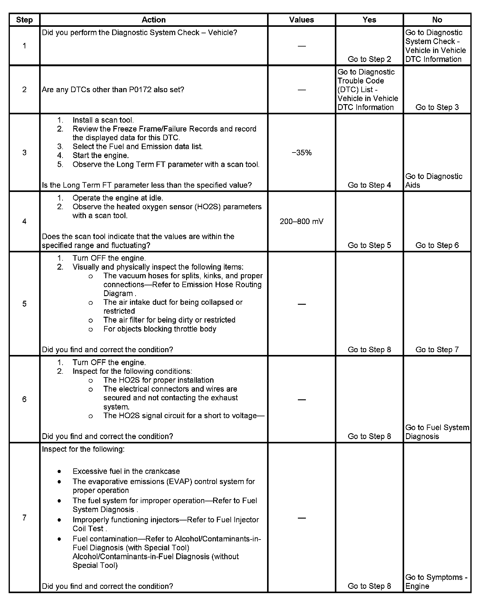 The powertrain control module (PCM) controls the air/fuel metering system in order to provide the best possible combination of driveability, fuel economy, and emission control. Fuel delivery is controlled differently during Open Loop and Closed Loop. During Open Loop, the PCM determines fuel delivery based on sensor signals, without heated oxygen sensor (HO2S) input. During Closed Loop, the PCM adds HO2S inputs and level of purge to calculate the short and long term fuel trim adjustments. If the HO2S indicates a lean condition, the fuel trim values will be greater than 0 percent. If the HO2S indicates a rich condition, the fuel trim values will be below 0 percent. The short term fuel trim values change rapidly in response to the HO2S voltage signals. The long term fuel trim makes coarse adjustments in order to maintain an air/fuel ratio of 14.7:1 The fuel trim diagnostic will conduct a test to determine if a rich failure actually exists or if excessive vapor from the evaporative emission (EVAP) canister is causing a rich condition. This DTC is continuously monitored during engine operation. If the PCM detects an excessively rich condition, DTC P0172 sets.