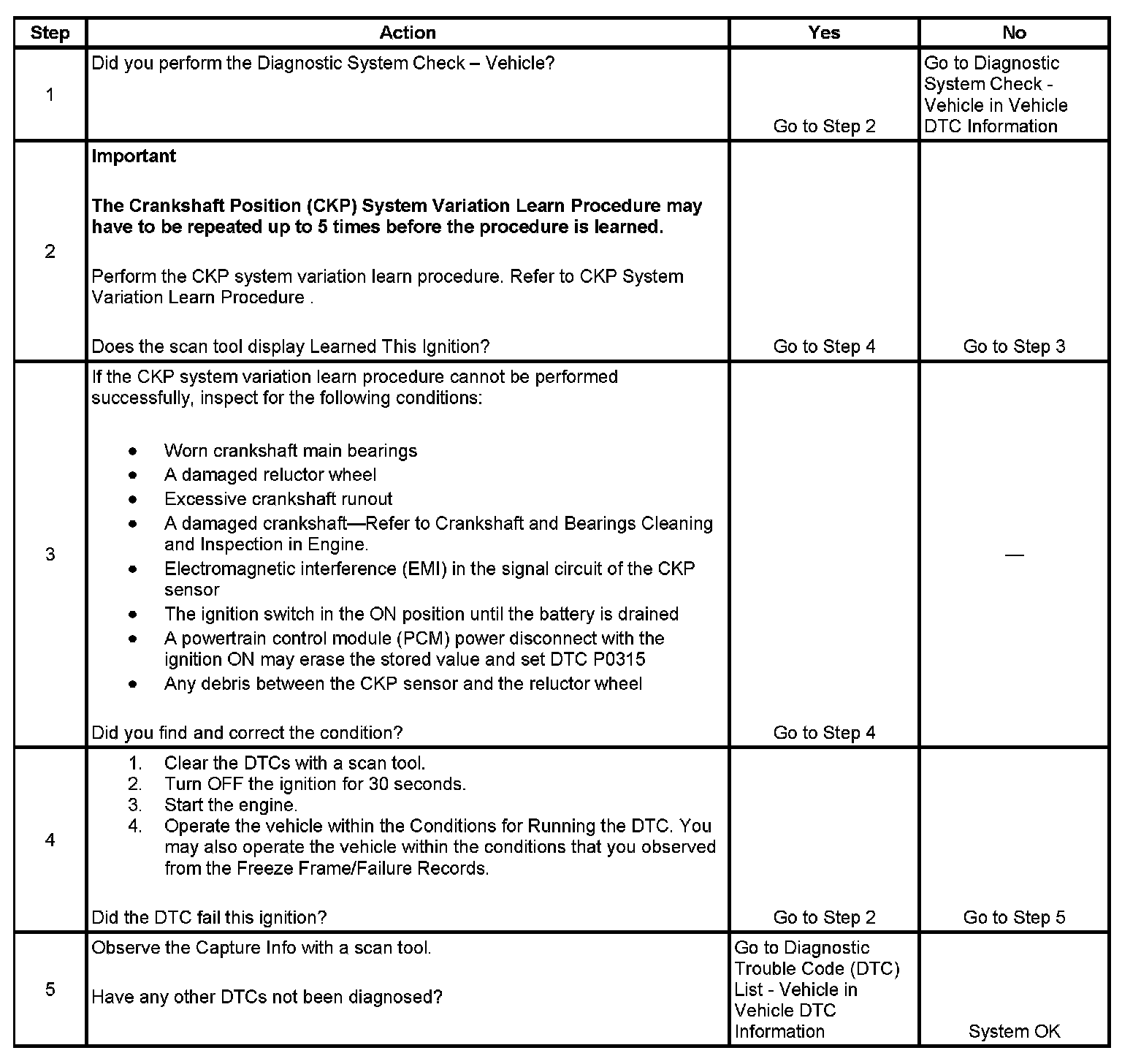 The crankshaft position (CKP) system variation learn feature is used to calculate reference period errors caused by slight tolerance variations in the crankshaft, and the CKP sensor. The calculated error allows the powertrain control module (PCM) to accurately compensate for reference period variations. This enhances the ability of the PCM to detect misfire events over a wider range of engine speed and load. The PCM stores the CKP system variation values after a learn procedure has been performed. If the actual CKP variation is not within the CKP system variation compensating values stored in the PCM, DTC P0300 may set. If the PCM detects the CKP system variation values are not stored in the PCM memory, DTC P0315 sets.