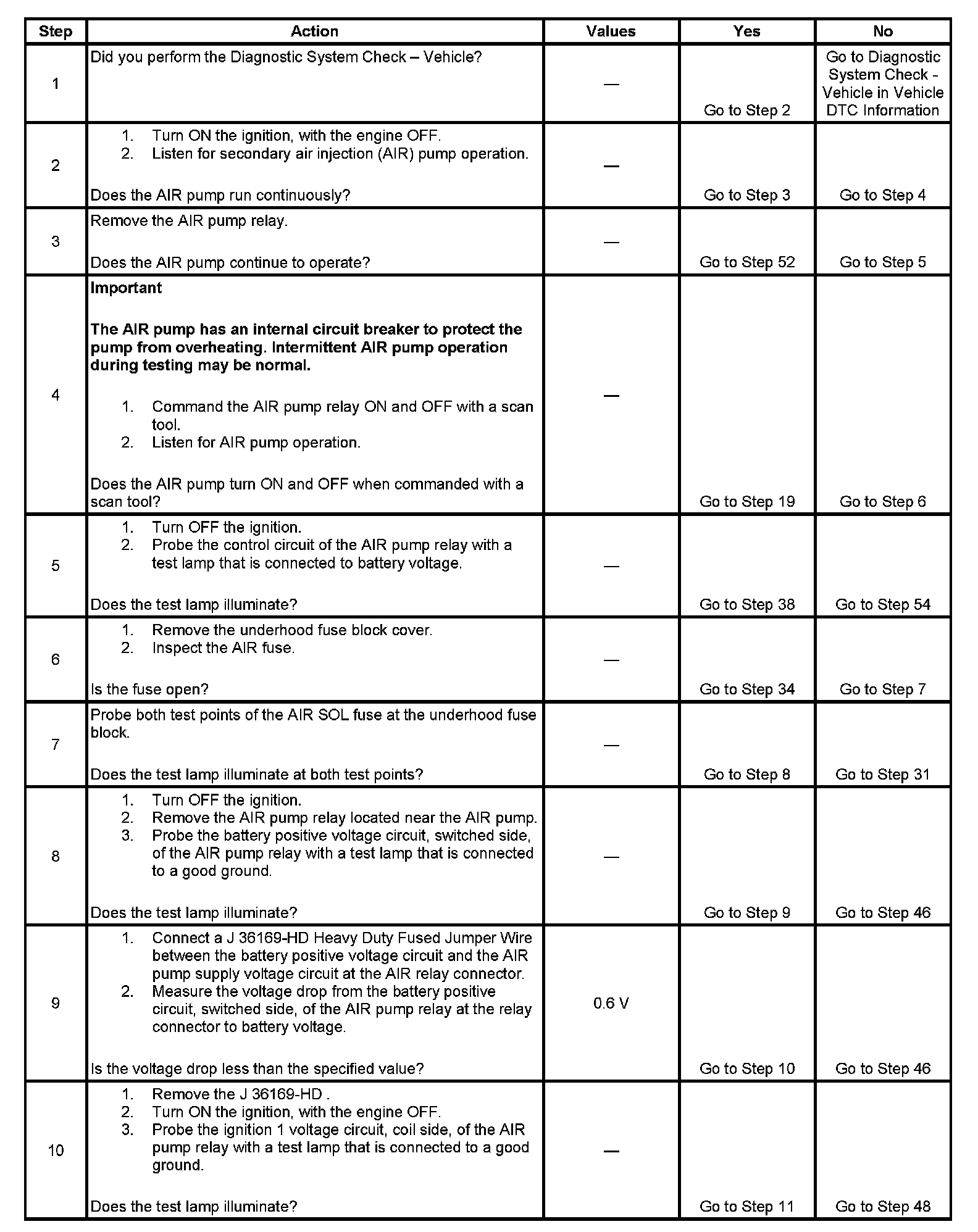 9. This step determines if excessive resistance on the supply voltage circuit between the AIR fuse and the AIR pump relay is the cause for an inoperative AIR pump. Two ohms of resistance on this circuit can prevent the AIR pump from running.
