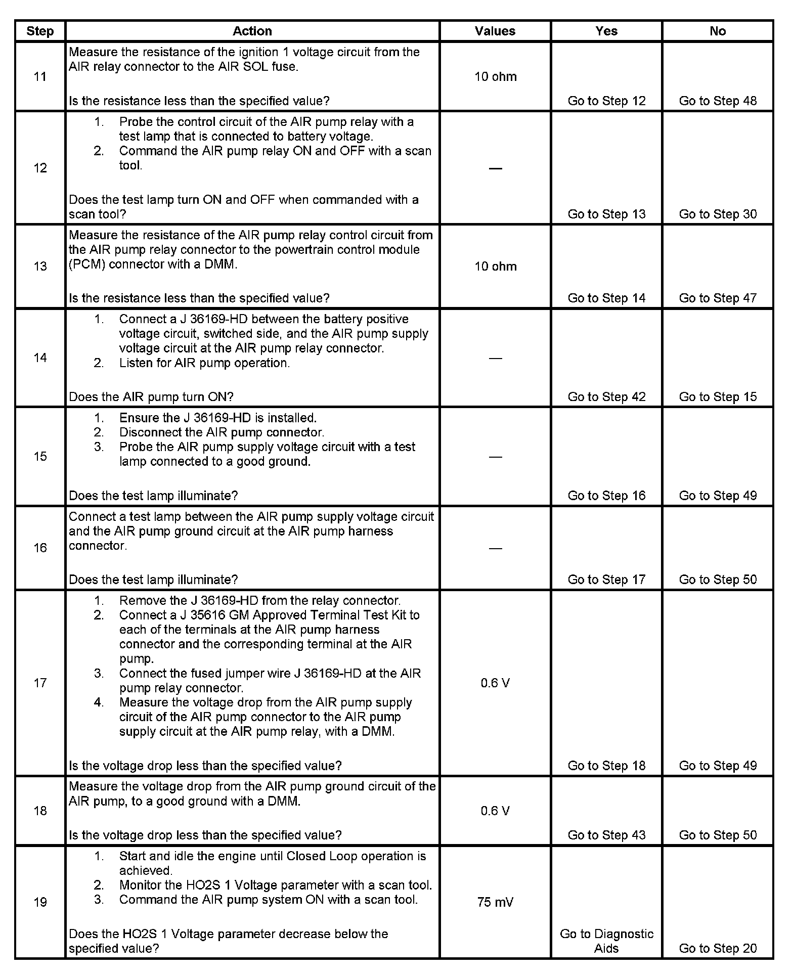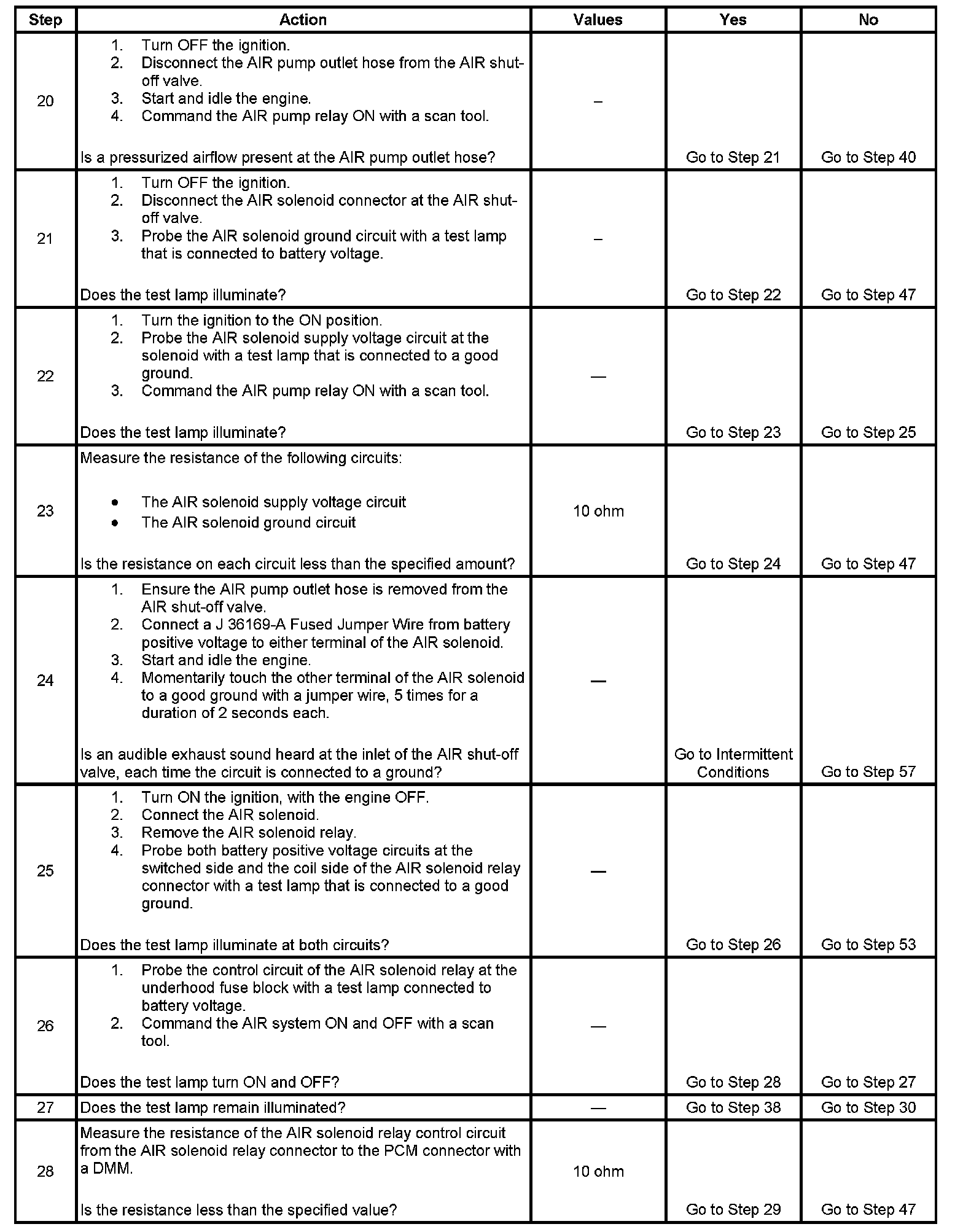 13. This step determines if excessive resistance on the AIR pump relay circuit and PCM driver is the cause for an inoperative AIR pump relay. The test lamp in series is intended to generate a electrical load on this circuit. 90 ohms of resistance on this circuit can prevent the AIR pump relay from operating.