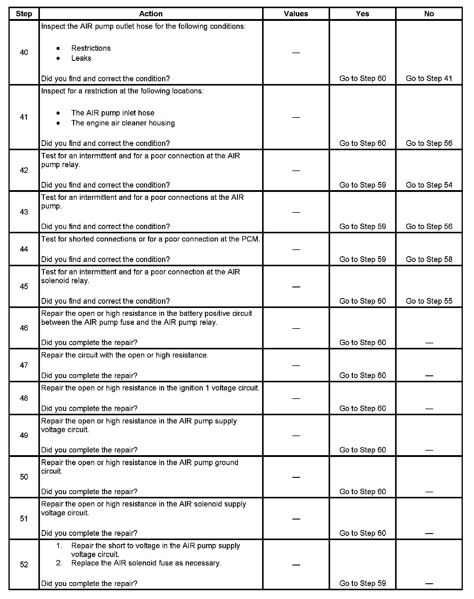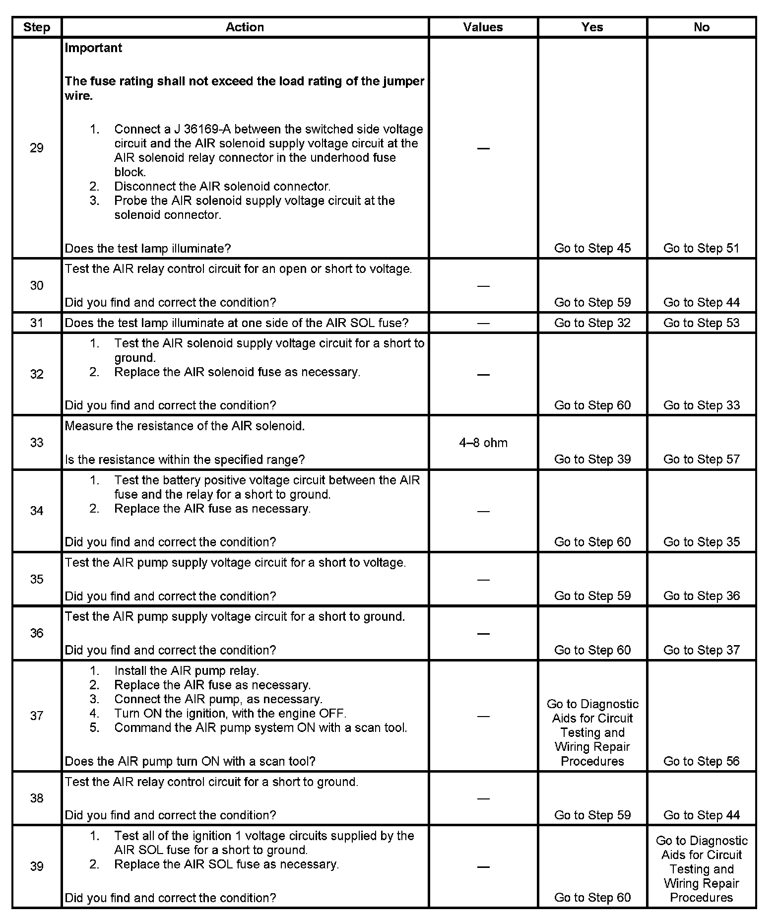 17. This step determines if excessive resistance on the supply circuit is the cause for an inoperative AIR pump. Two ohms of resistance on this circuit can prevent the AIR pump from running.
