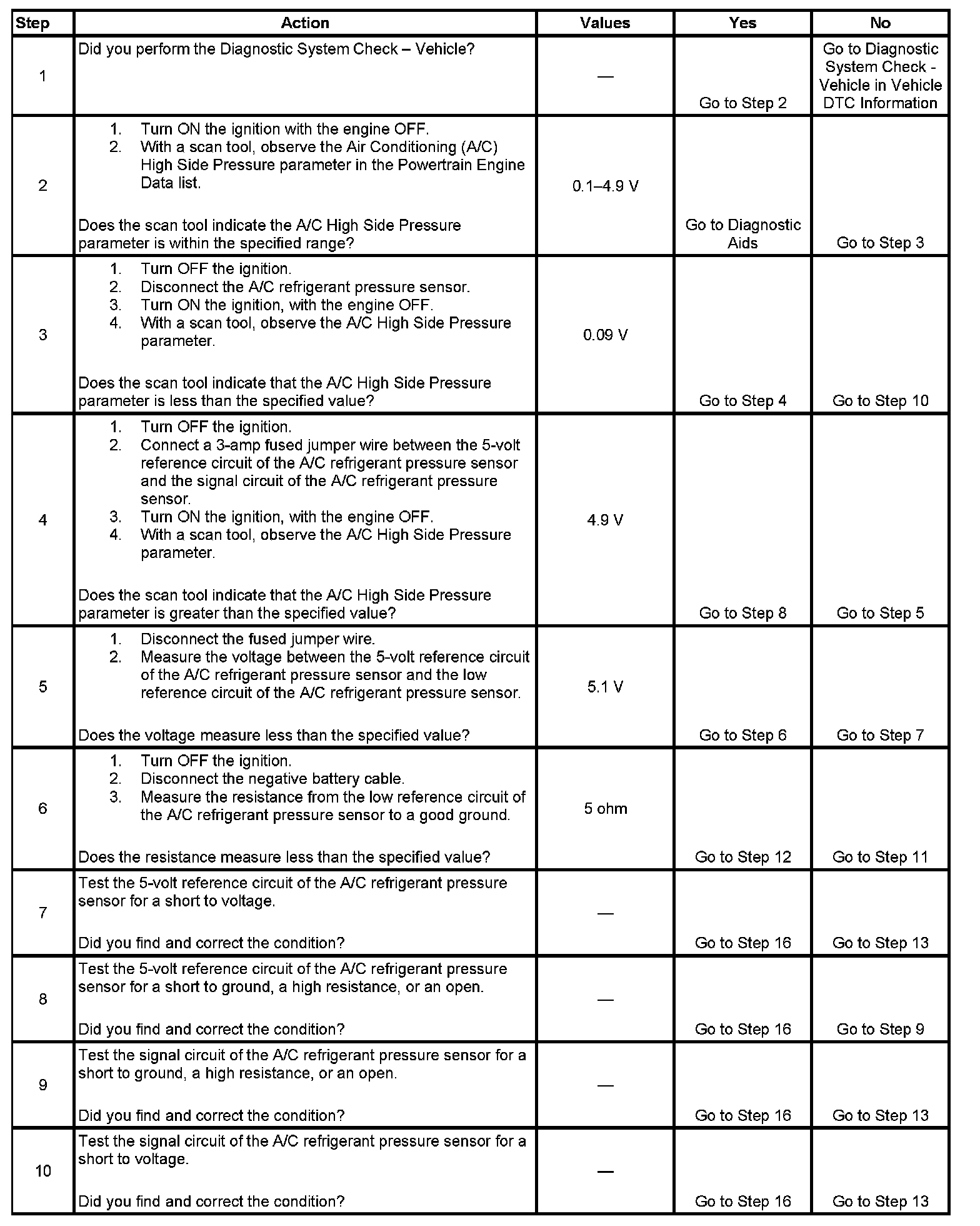 - The A/C refrigerant pressure sensor signal is greater than 4.9 volts for 5 seconds.