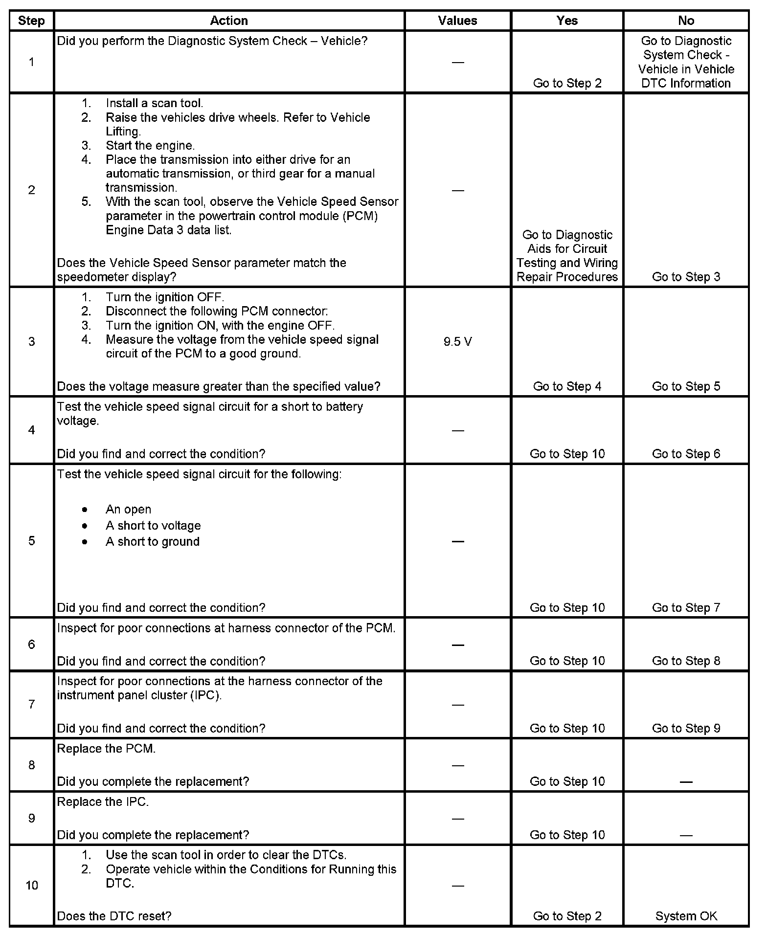The powertrain control module (PCM) creates the vehicle speed output signal by pulsing the circuit to ground. The PCM monitors the voltage on the vehicle speed output circuit. If the PCM determines that the voltage is out of the normal operating range, a DTC sets.