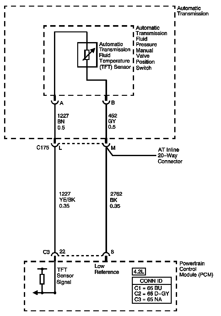 The automatic transmission fluid temperature (TFT) sensor is part of the automatic transmission fluid pressure (TFP) manual valve position switch. The TFT sensor is a resistor, or thermistor, which changes value based on temperature. The sensor has a negative-temperature coefficient. This means that as the temperature increases, the resistance decreases, and as the temperature decreases, the resistance increases. The powertrain control module (PCM) supplies a 5-volt reference signal to the sensor on the TFT sensor signal circuit and measures the voltage drop in the circuit. When the transmission fluid is cold, the sensor resistance is high and the PCM detects high signal voltage. As the fluid temperature warms to a normal operating temperature, the resistance becomes less and the signal voltage decreases. The PCM uses this information to control shift quality and torque converter clutch apply.