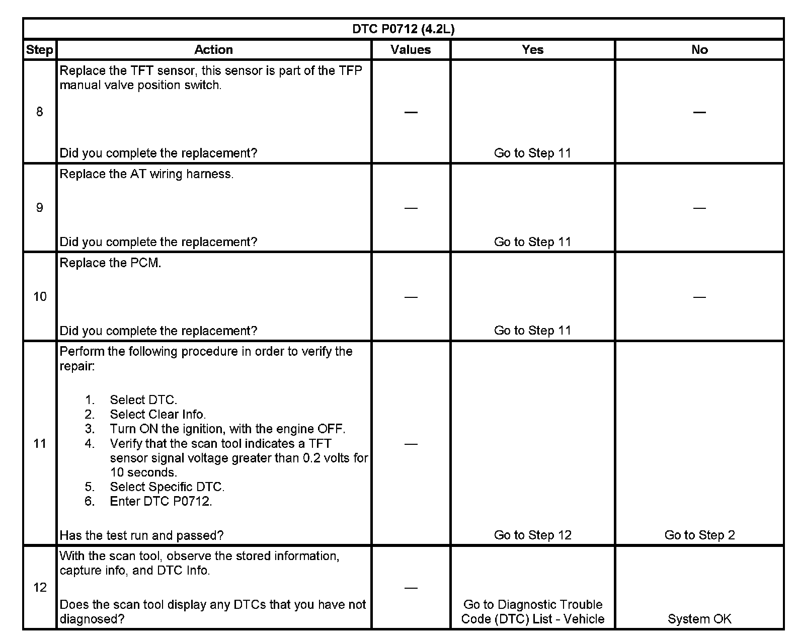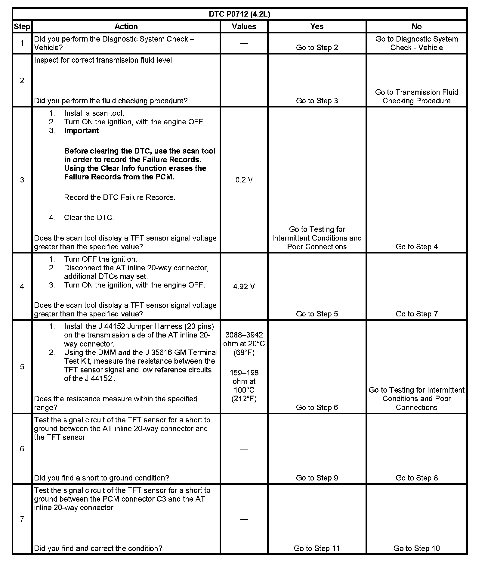 When the PCM detects a continuous short to ground in the TFT signal circuit or in the TFT sensor, then DTC P0712 sets. DTC P0712 is a type C DTC.