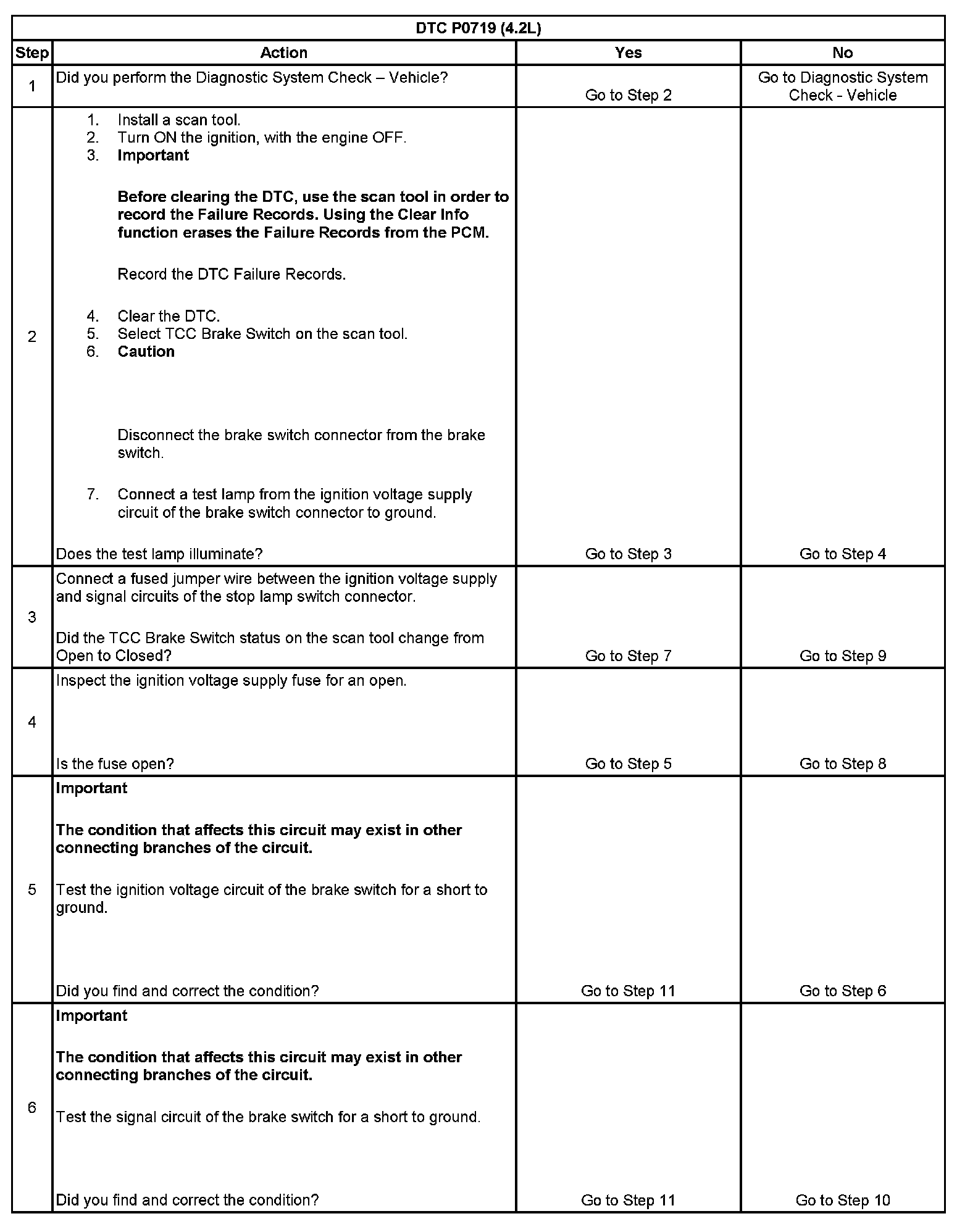 When the PCM detects an open brake switch circuit, 0 volts, low input, during accelerations, then DTC P0719 sets. DTC P0719 is a type C DTC.