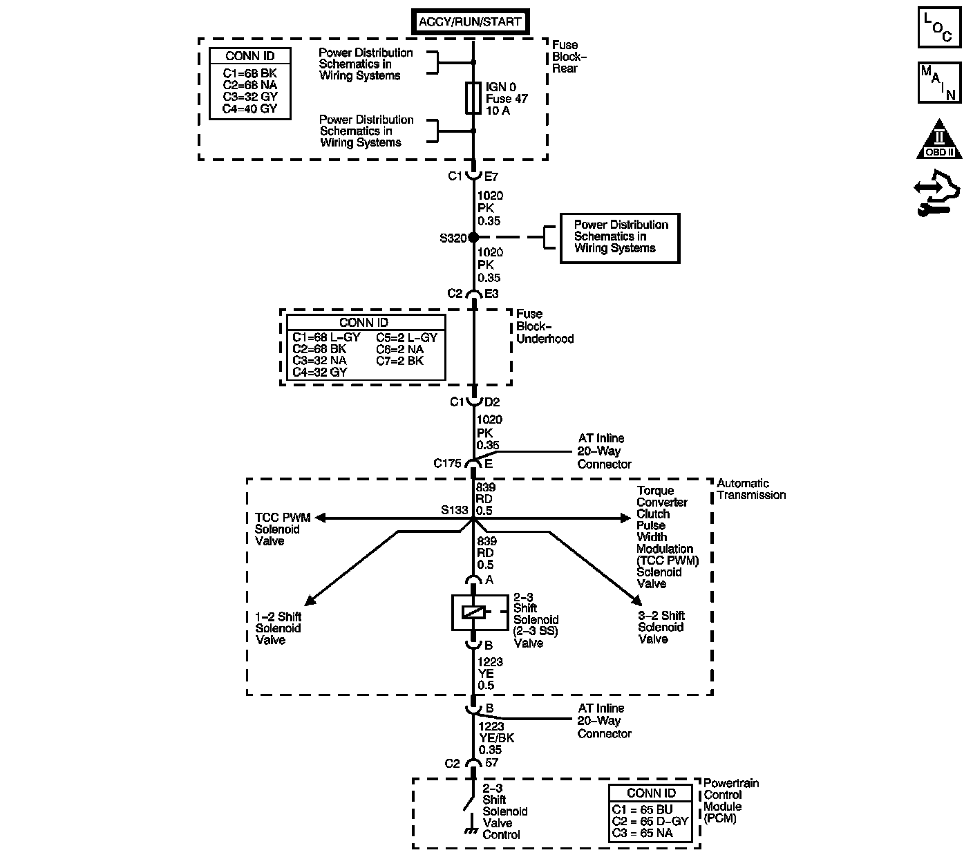The 2-3 shift solenoid (SS) valve controls the fluid flow acting on the 2-3 shift valves. The solenoid is a normally-open exhaust valve. With the 1-2 SS valve, the 2-3 SS valve allows 4 different shifting combinations. The solenoid attaches to the control valve body within the transmission. The 2-3 SS valve receives ignition voltage through the ignition 0 voltage circuit. The powertrain control module (PCM) controls the solenoid by providing the ground path on the 2-3 SS valve control circuit.