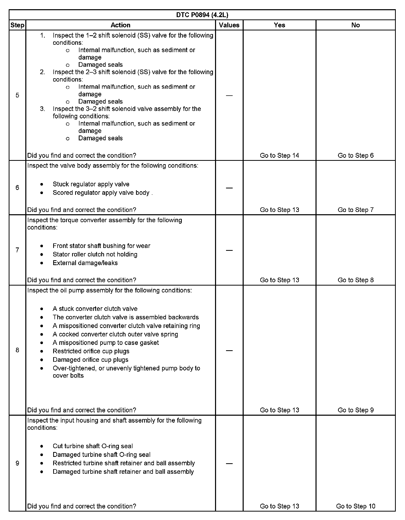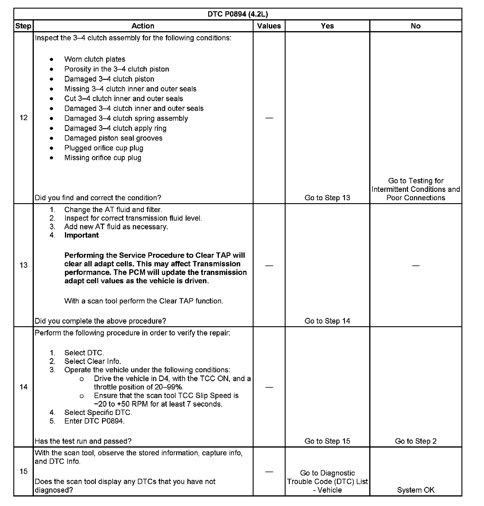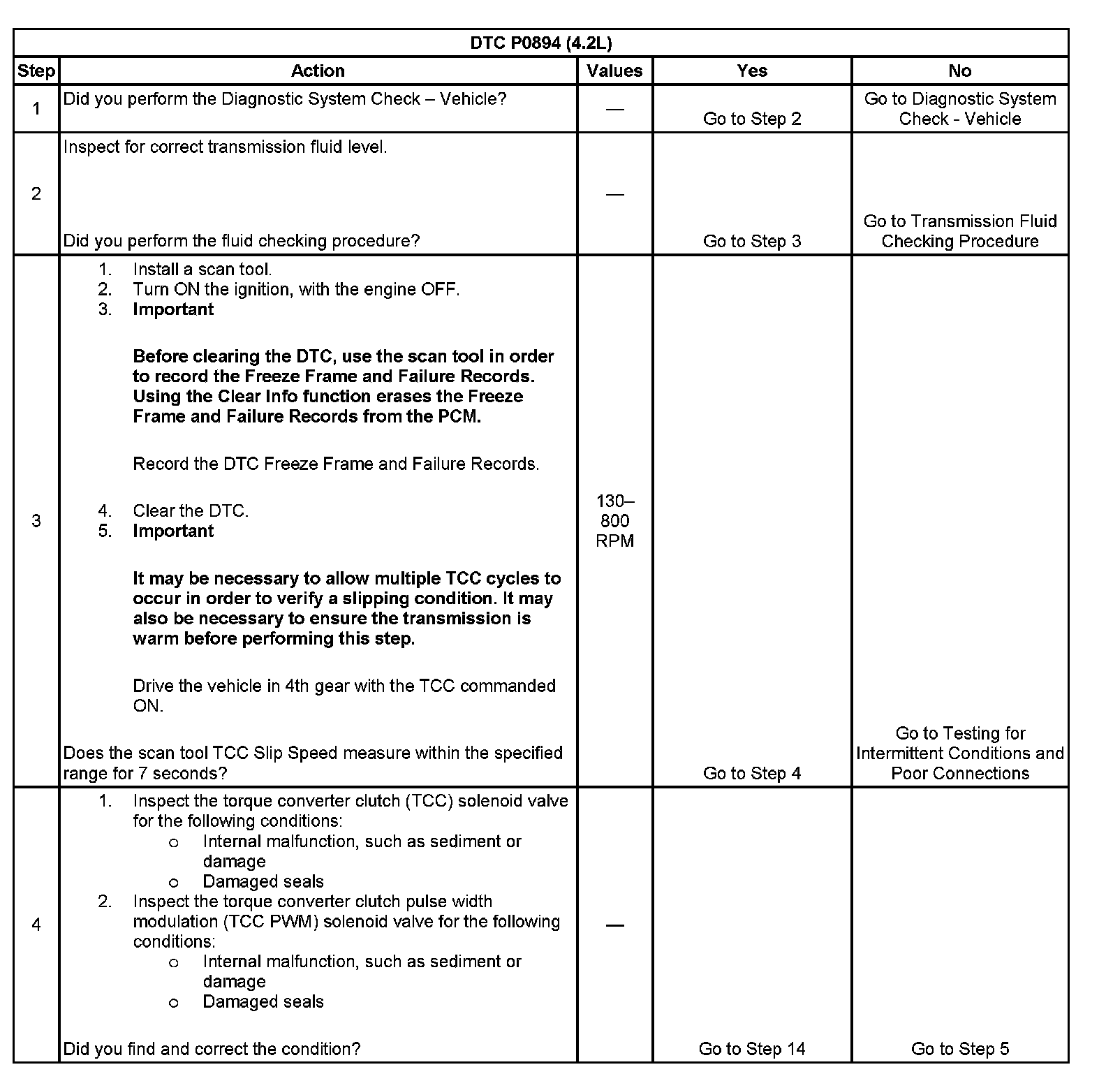 When the PCM detects excessive TCC slip when the TCC should be engaged, then DTC P0894 sets. DTC P0894 is a type B DTC.