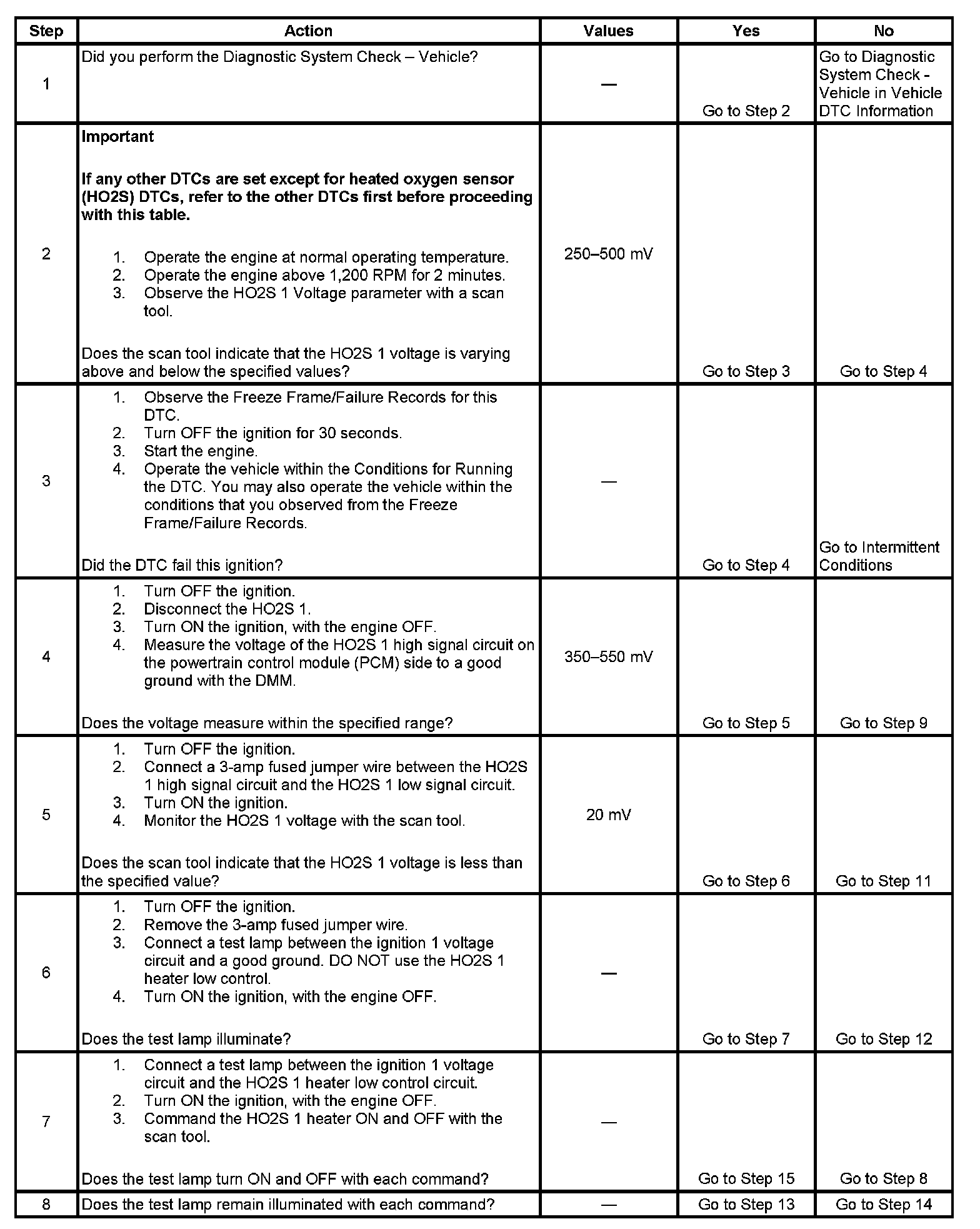 2. When the system is operating correctly, the HO2S 1 voltage should toggle above and below the specified values. You may need to operate the vehicle within the Freeze Frame conditions and Conditions for Setting the DTC in order to duplicate the malfunction that was detected by the PCM.