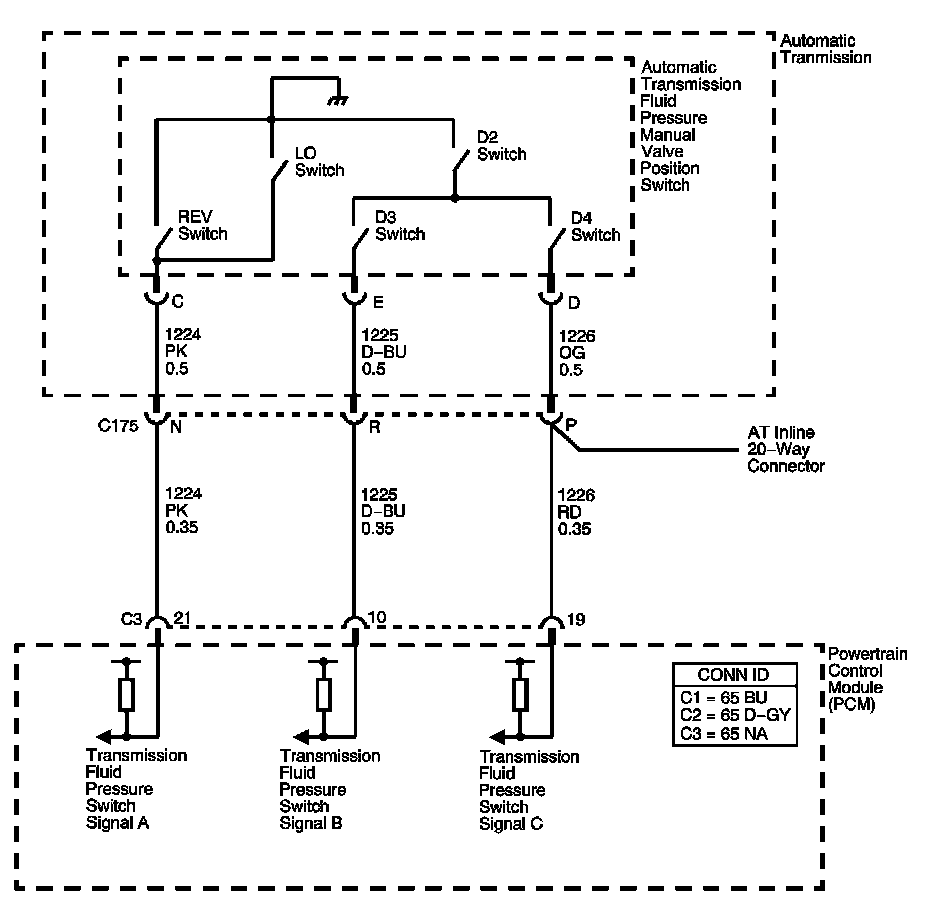The TFP manual valve position switch cannot distinguish between PARK and NEUTRAL because the monitored valve body pressures are identical. With the engine OFF and the ignition switch in the ON position, the TFP manual valve position switch indicates PARK/NEUTRAL. Disconnecting the AT inline 20-way connector removes the ground potential for the 3 range signals to the PCM. In this case, with the engine OFF, and the ignition switch in the ON position, D2 will be indicated.