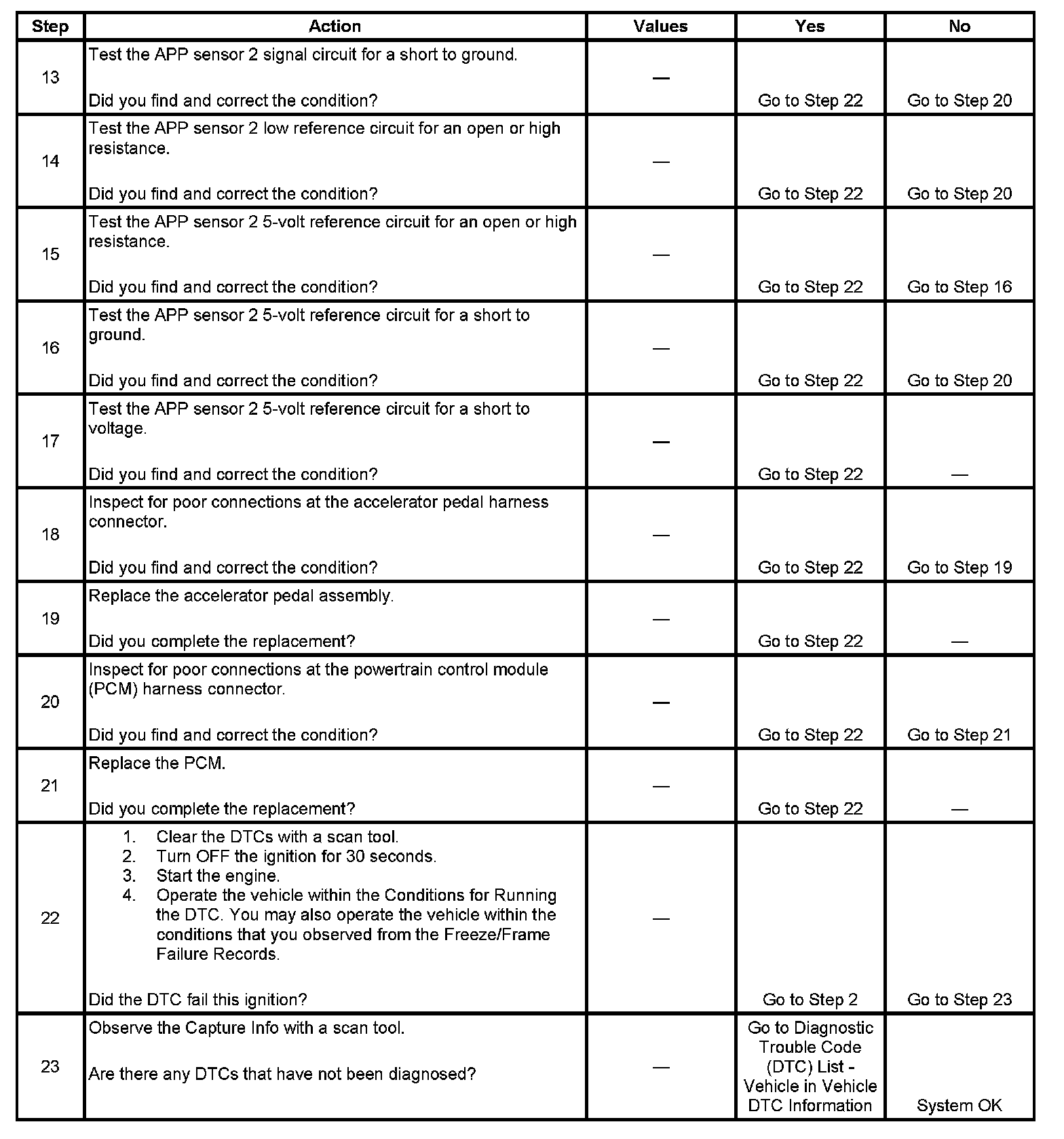 This provides the powertrain control module (PCM) with a signal voltage proportional to accelerator pedal movement. The APP sensor 1 signal voltage at rest position is near the low reference and increases as the pedal is actuated. The APP sensor 2 signal voltage at rest position is near the 5-volt reference and decreases as the pedal is actuated. When APP sensor 2 signal voltage is not within the predicted range, this code sets.
