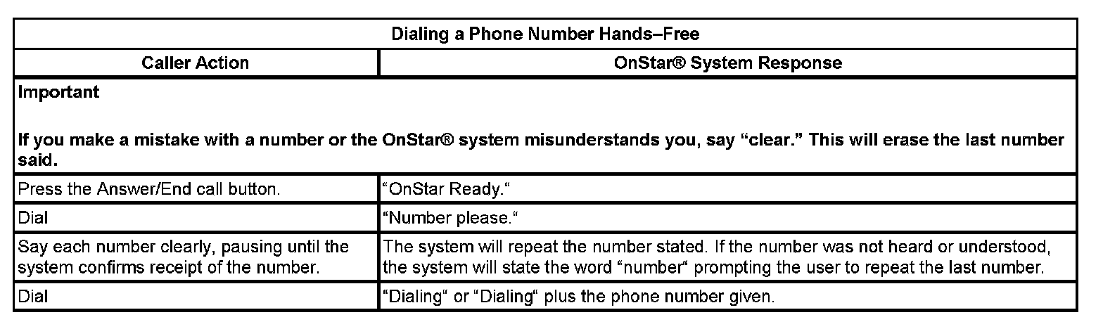 During a hands-free call, the microphone and audio system operate the same way as a standard OnStar(R) call. When the Answer/End Call button is pressed, the audio system will mute; the OnStar(R) system will then return the prompt "OnStar Ready". At this point there are specific commands set to initiate a cellular call. If the vehicle receives a call when the radio is ON, the audio system will mute and an audible ring will be heard though the speakers. The call will be answered when the answer/end call button is pressed.