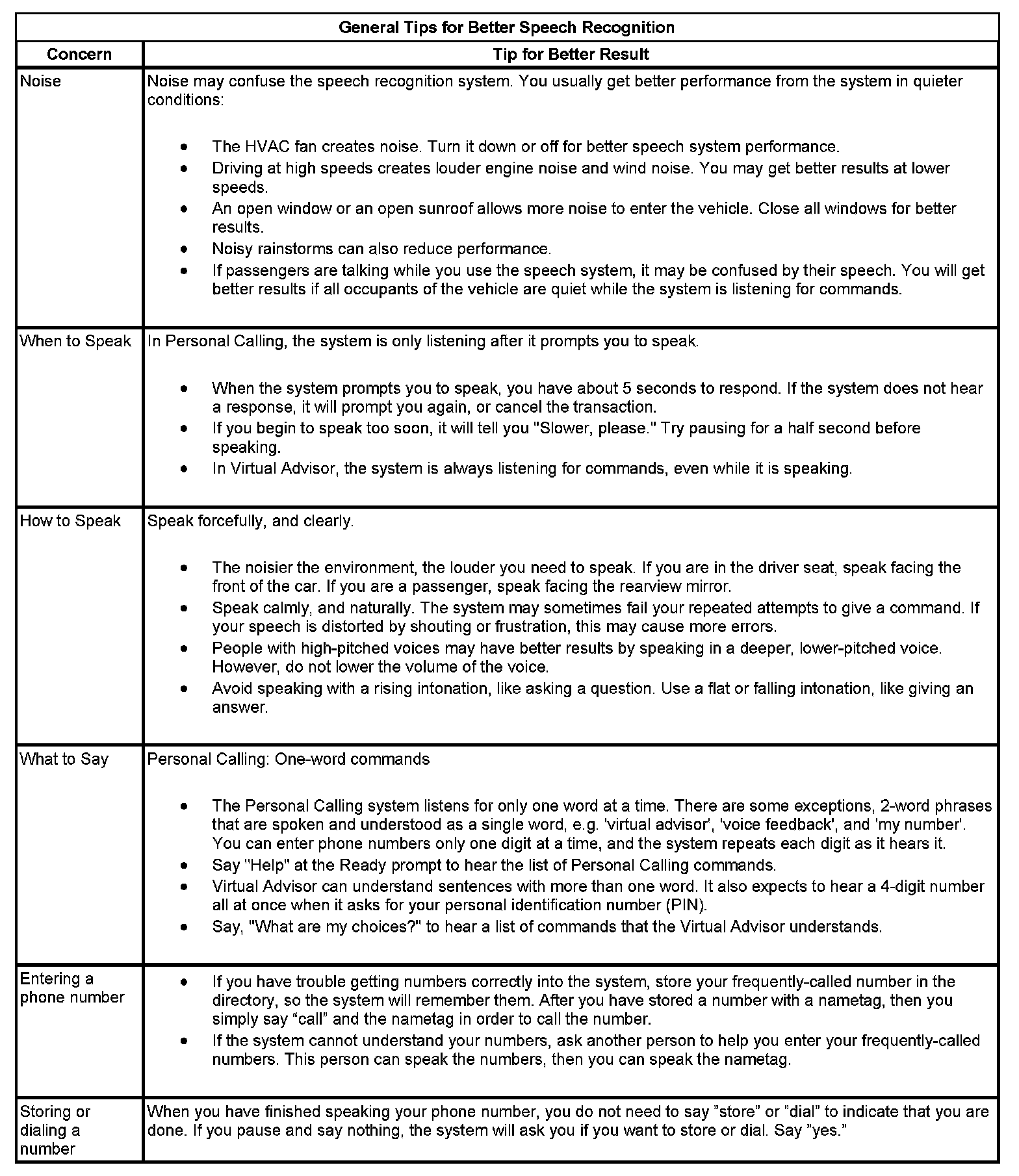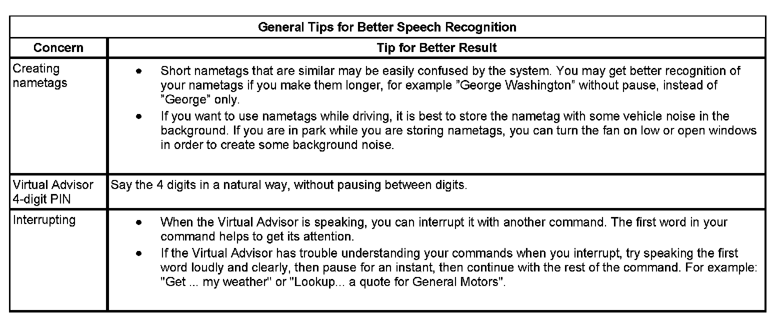 The OnStar(R) speech recognition systems use speech technology that is designed to understand a wide range of American English speakers. Although there is no one right way to speak English, the system will work best when users try to modify their pronunciation should they encounter difficulty. Users who do not obtain good results are advised to try the tips and work arounds.