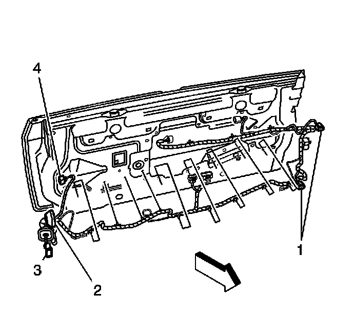 1. Install the endgate wiring harness to body harness connector (3) into the small access hole of the endgate, and out the endgate wiring harness grommet hole.