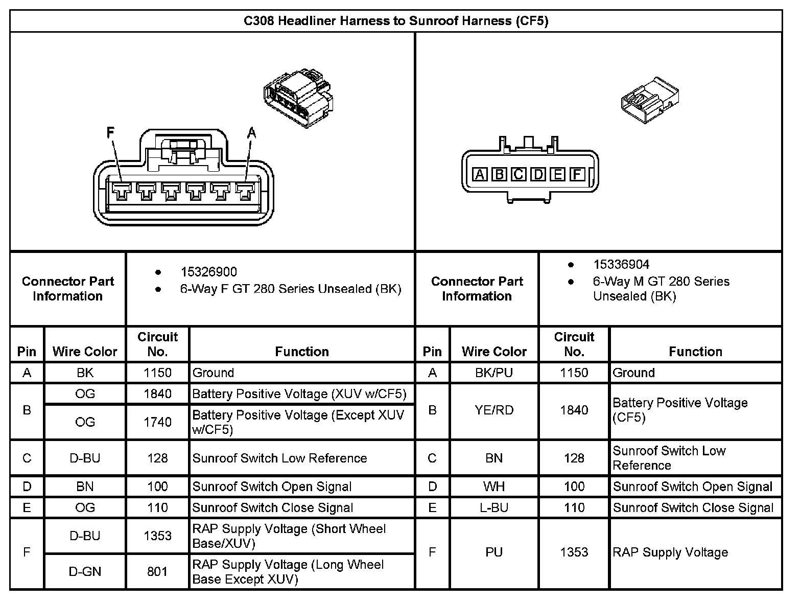 C308 Headliner Harness To Sunroof Harness (With RPO Code CF5):