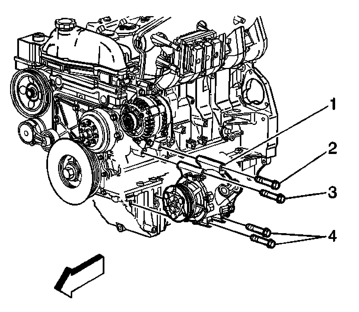 2. Remove the A/C compressor bottom bolts (4) and loosen the top bolts (2, 3).