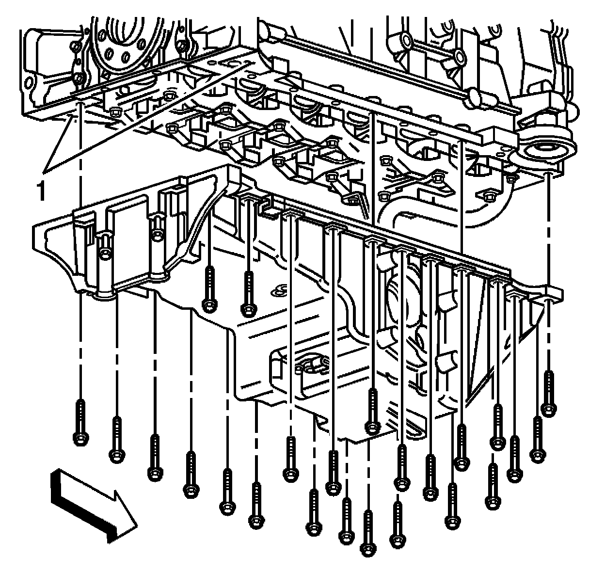 11. Place 2 oil pan bolts in the jack screws on the oil pan and tighten evenly to release the oil pan from the engine (1).