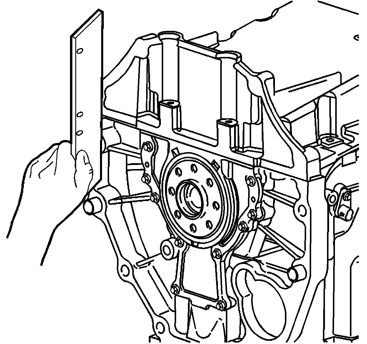 4. Inspect the oil pan alignment. Use a straight edge on the back of the block and the oil pan transmission mounting surface.
