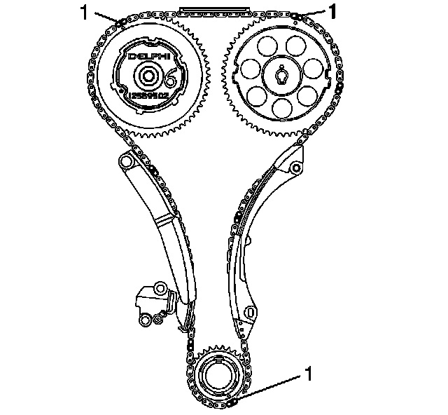 17. The dark links (1) on the chain should be aligned with marks on sprockets as shown.