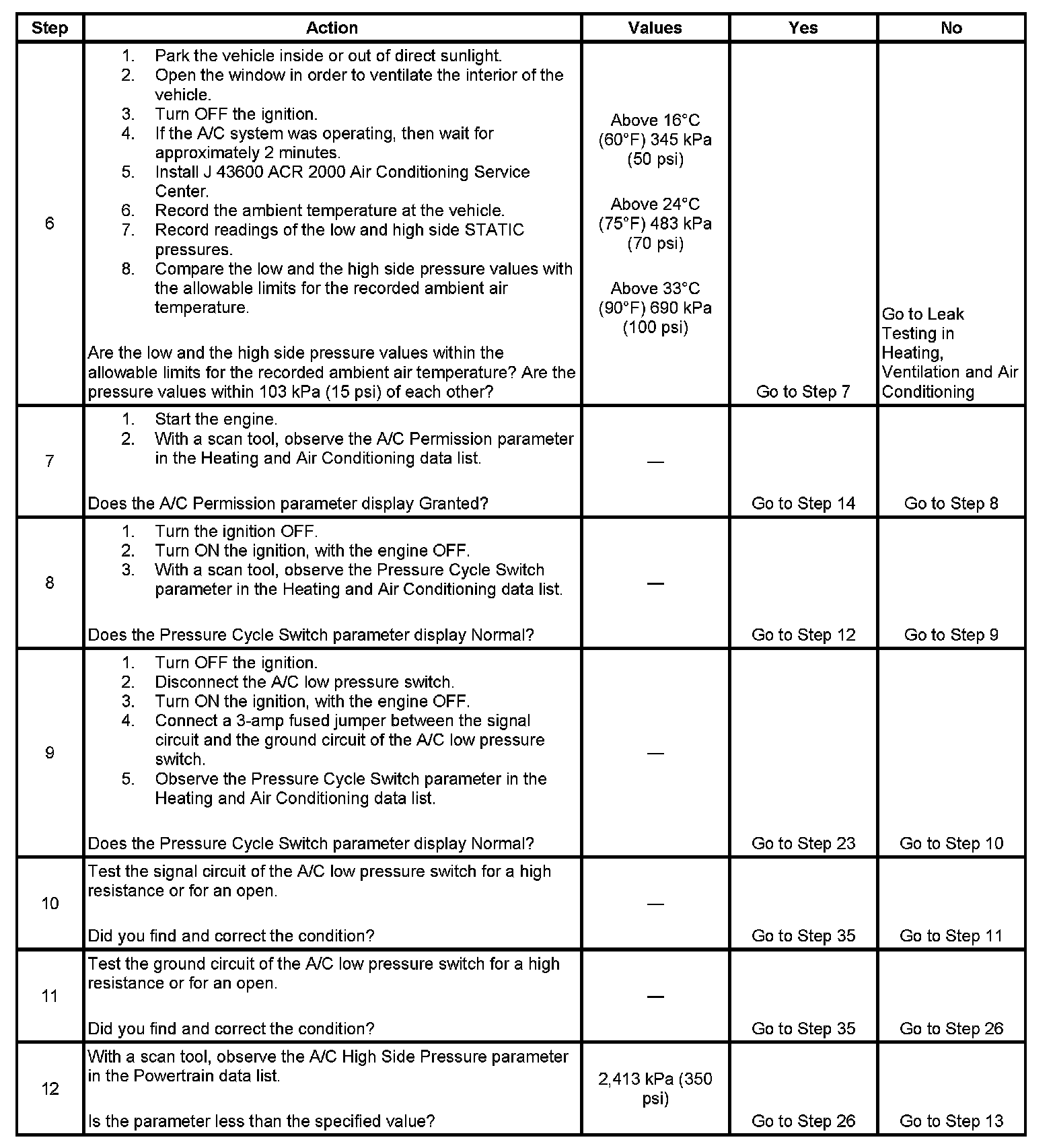 6. This test ensures that there is sufficient refrigerant in the A/C system. The specific values come from the A/C System Performance Test in Heating, Ventilation and Air Conditioning.