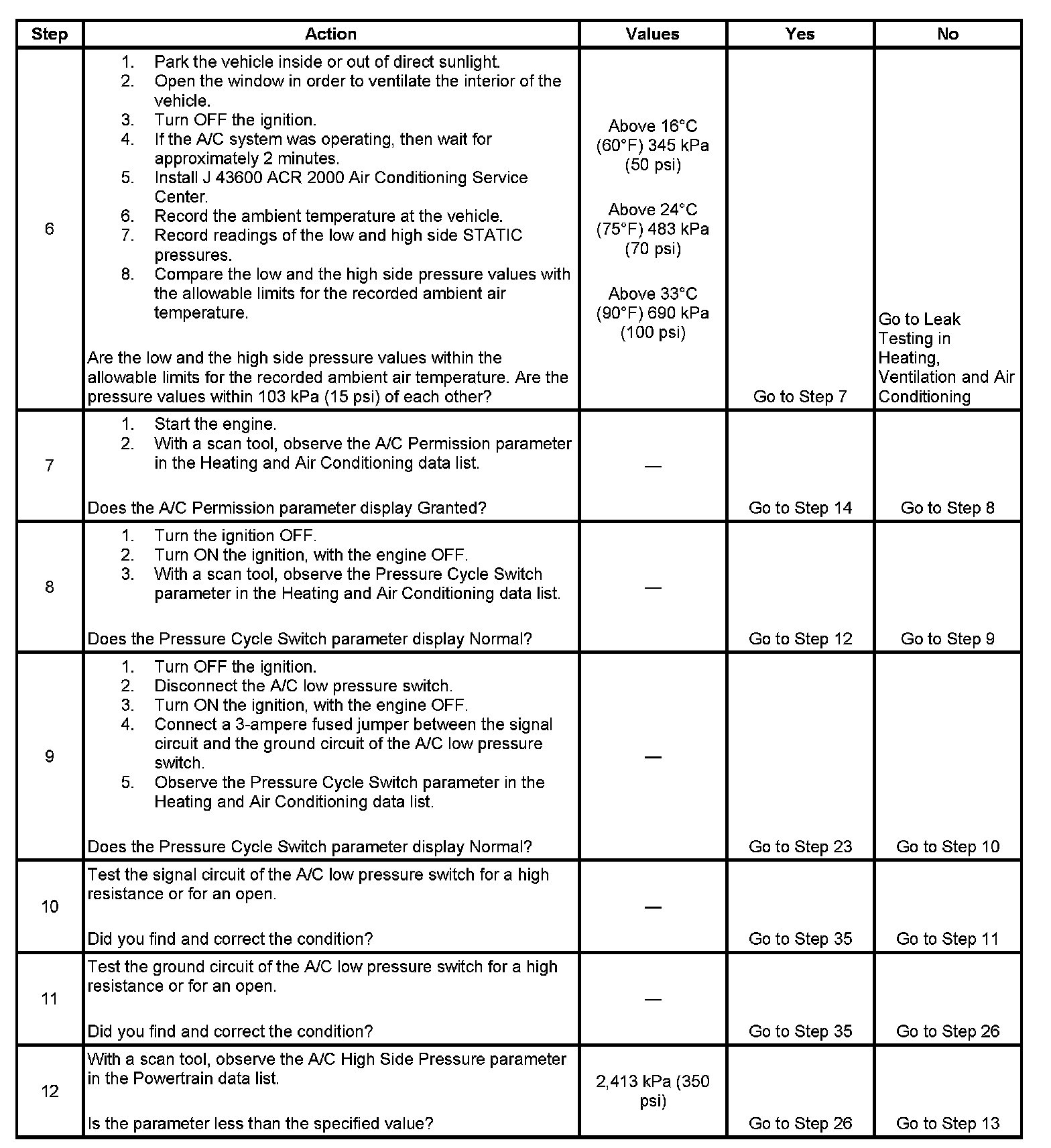 6. This test ensures that there is sufficient refrigerant in the A/C system. The specific values come from the A/C System Performance Test in Heating, Ventilation and Air Conditioning.