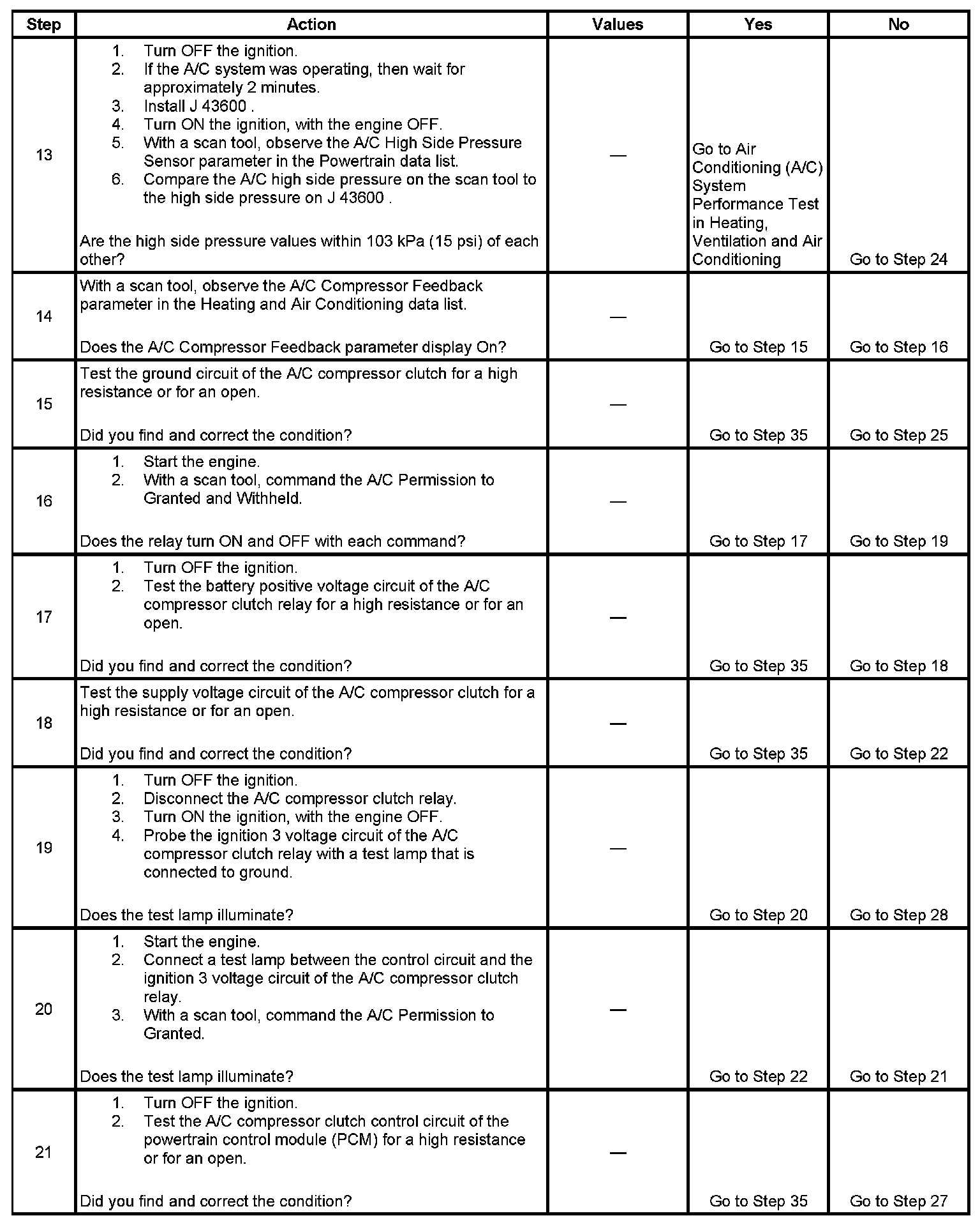 12. The A/C compressor relay output from the powertrain control module (PCM) is disabled if the A/C high side system pressure is interpreted to be higher than 2413 kPa (350 psi).