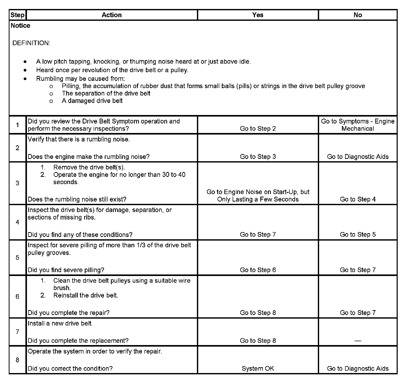 3. This test is to verify that the drive belt(s) is causing the rumbling noise. Rumbling noise may be confused with an internal engine noise due to the similarity in the description. Remove only one drive belt at a time if the vehicle has multiple drive belts. When removing the drive belt the water pump may not be operating and the engine may overheat. Also DTCs may set when the engine is operating with the drive belt removed.