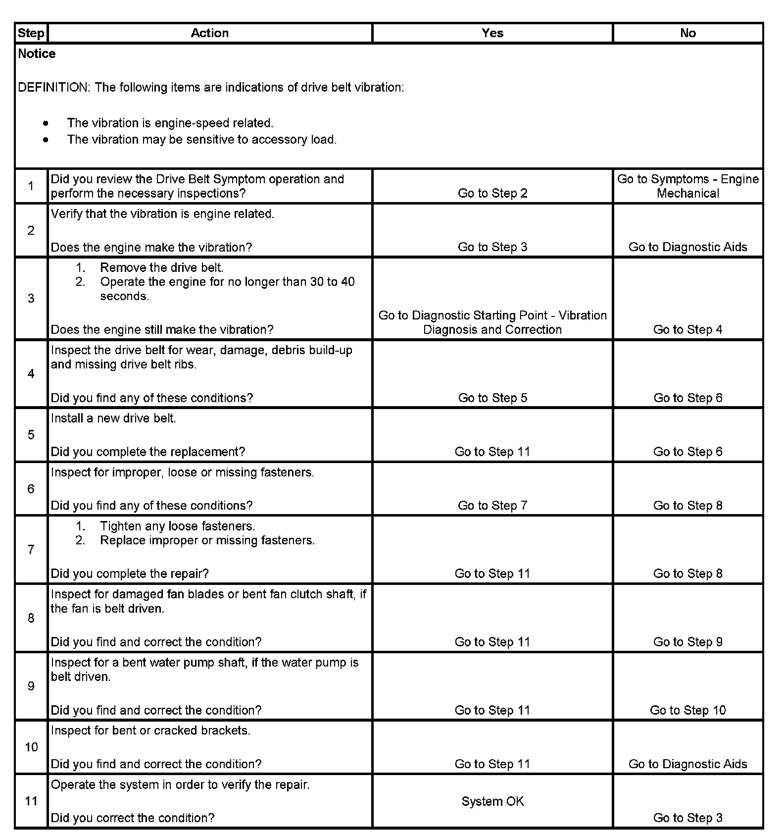3. This test is to verify that the drive belt(s) or accessory drive components may be causing the vibration. When removing the drive belt the water pump may not be operating and the engine may overheat. Also DTCs may set when the engine is operating with the drive belt removed.