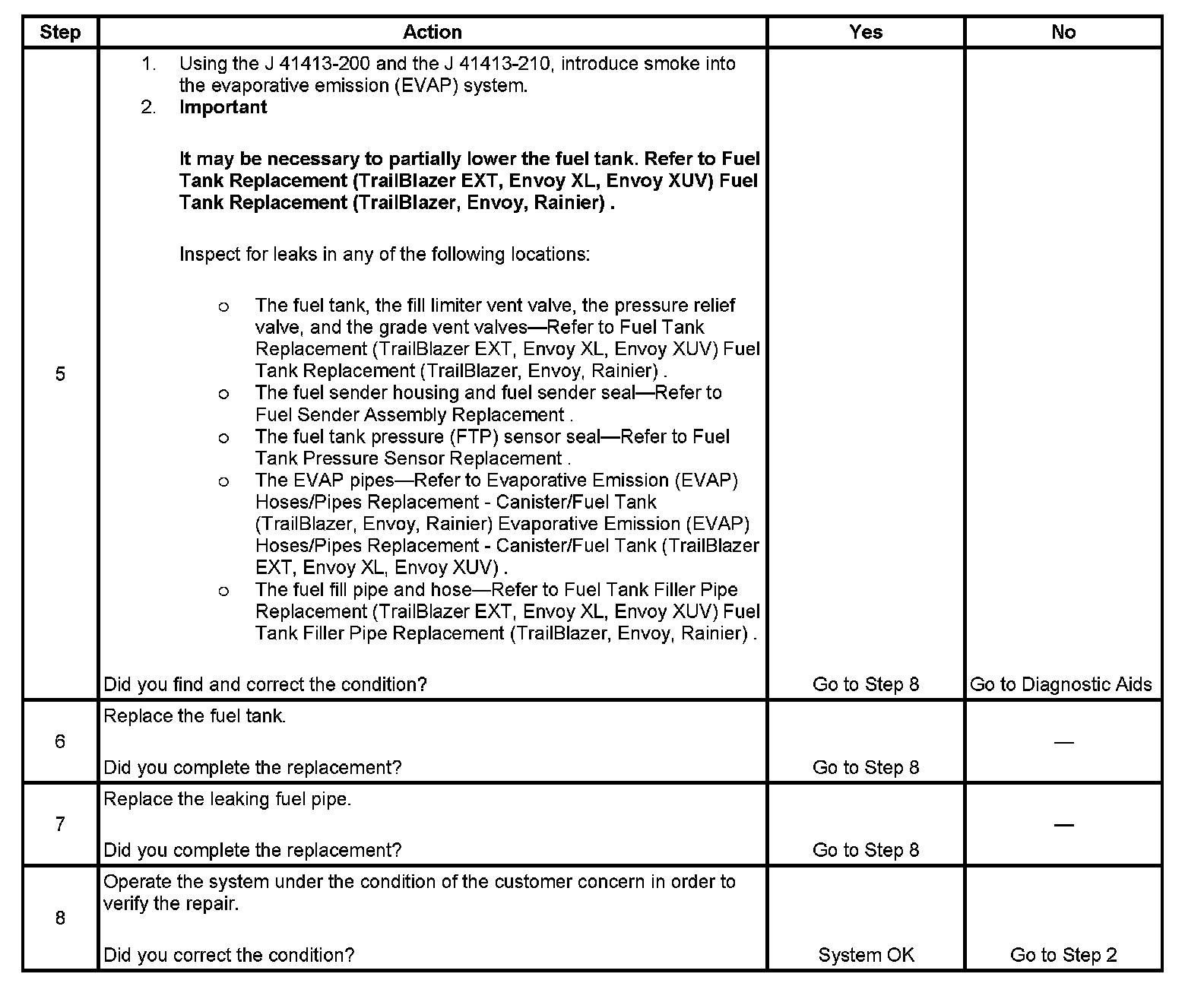 The fuel tank leak test is used to locate any fuel or fuel vapor escaping the fuel tank area. Fuel vapors escaping above the fuel level will be detected, if more than the calibrated amount, when the evaporative emission (EVAP) diagnostics complete one test cycle. The malfunction indicator lamp (MIL) will illuminate after the EVAP diagnostics have failed 2 test cycles.