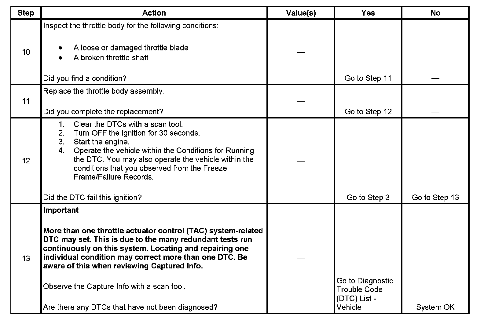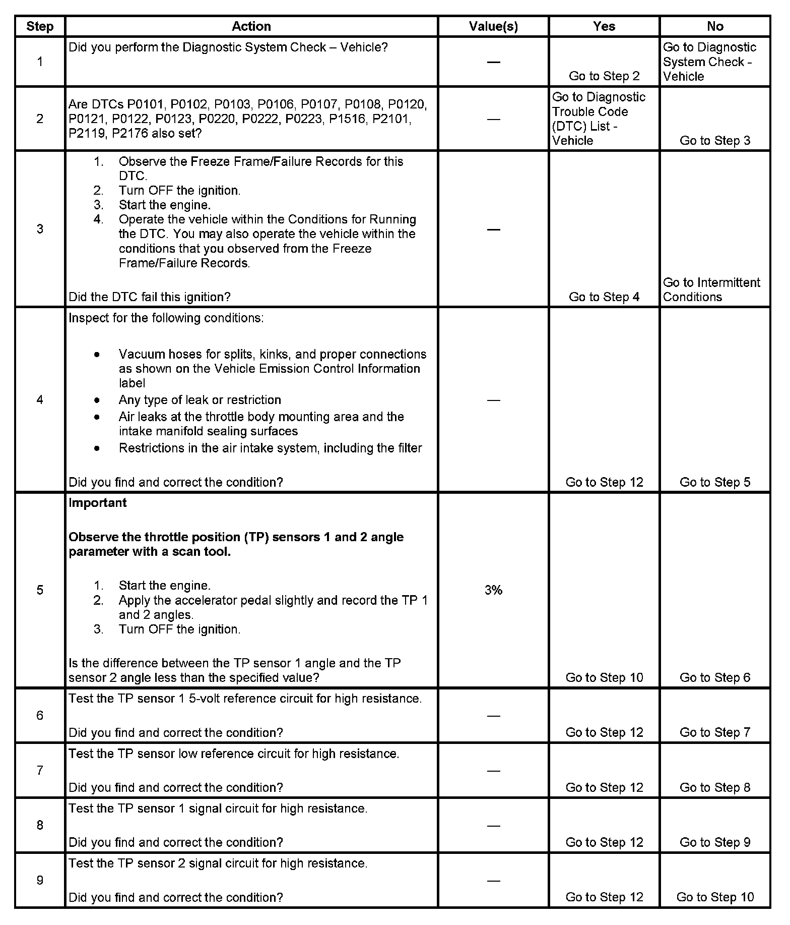 - DTCs P0101, P0102, P0103, P0106, P0107, P0108, P0120, P0121, P0122, P0123, P0220, P0221, P0222, P0223, P0601, P0602, P0603, P0604, P0606, P0607, P1516, P2101 are not set.