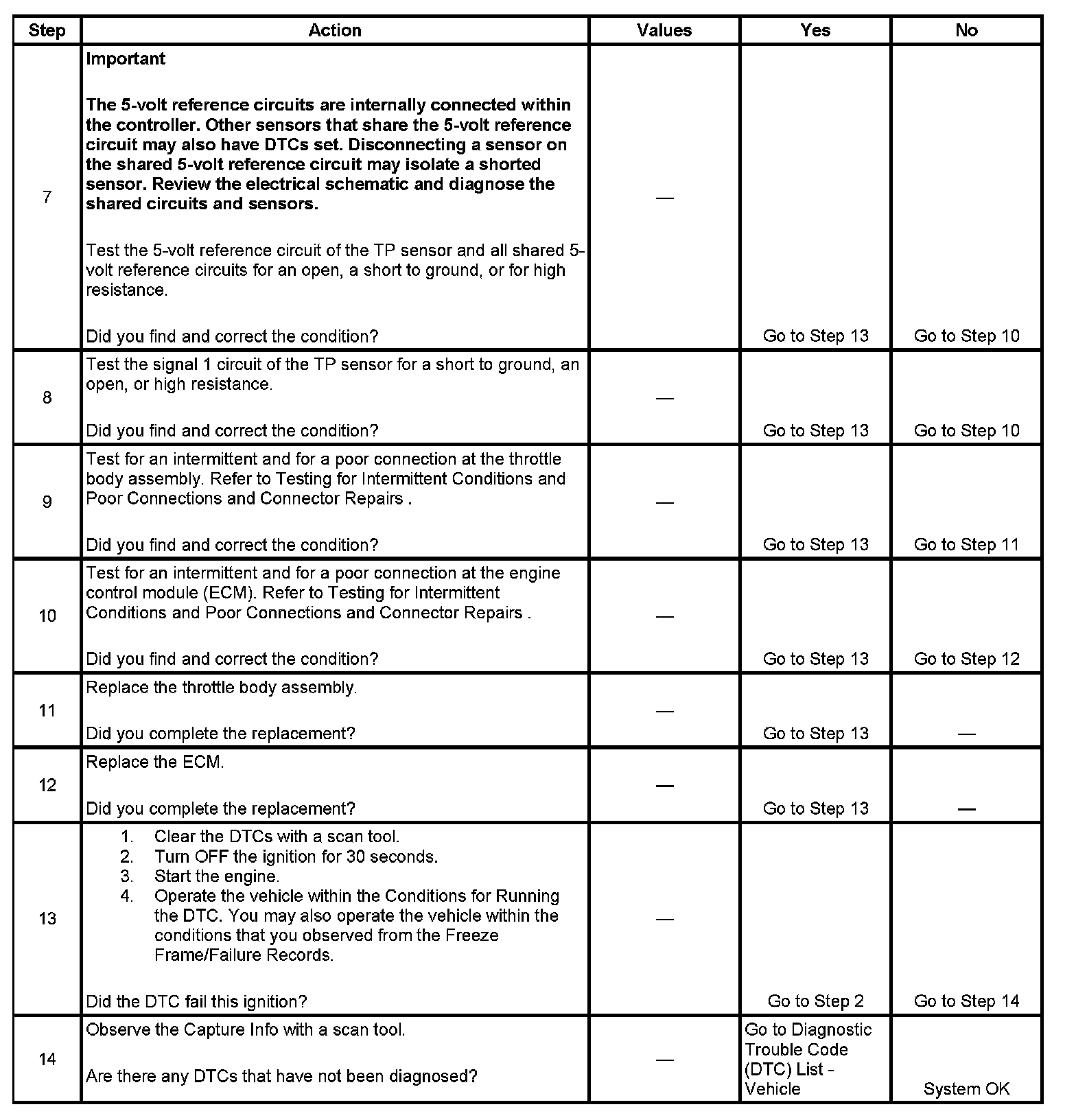 6. This step tests the signal 1 circuit of the TP sensor. If the TP sensor 1 voltage parameter is not within 4.8-5.2 volts, test for a condition in the signal 1 circuit.