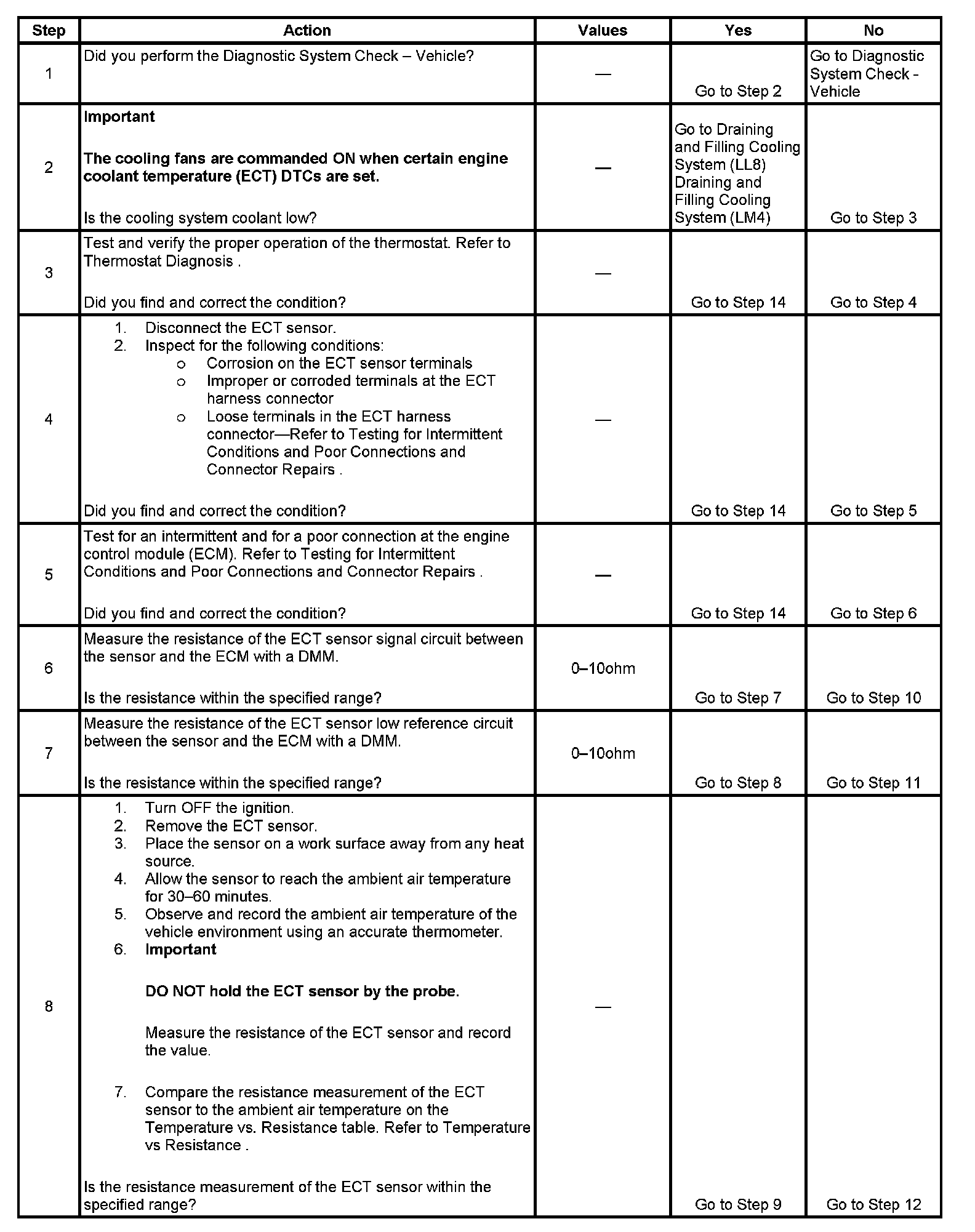 An engine coolant temperature (ECT) sensor monitors the temperature of the coolant. This input is used by the engine control module (ECM) for engine control, and as an enabling criteria for some diagnostics.