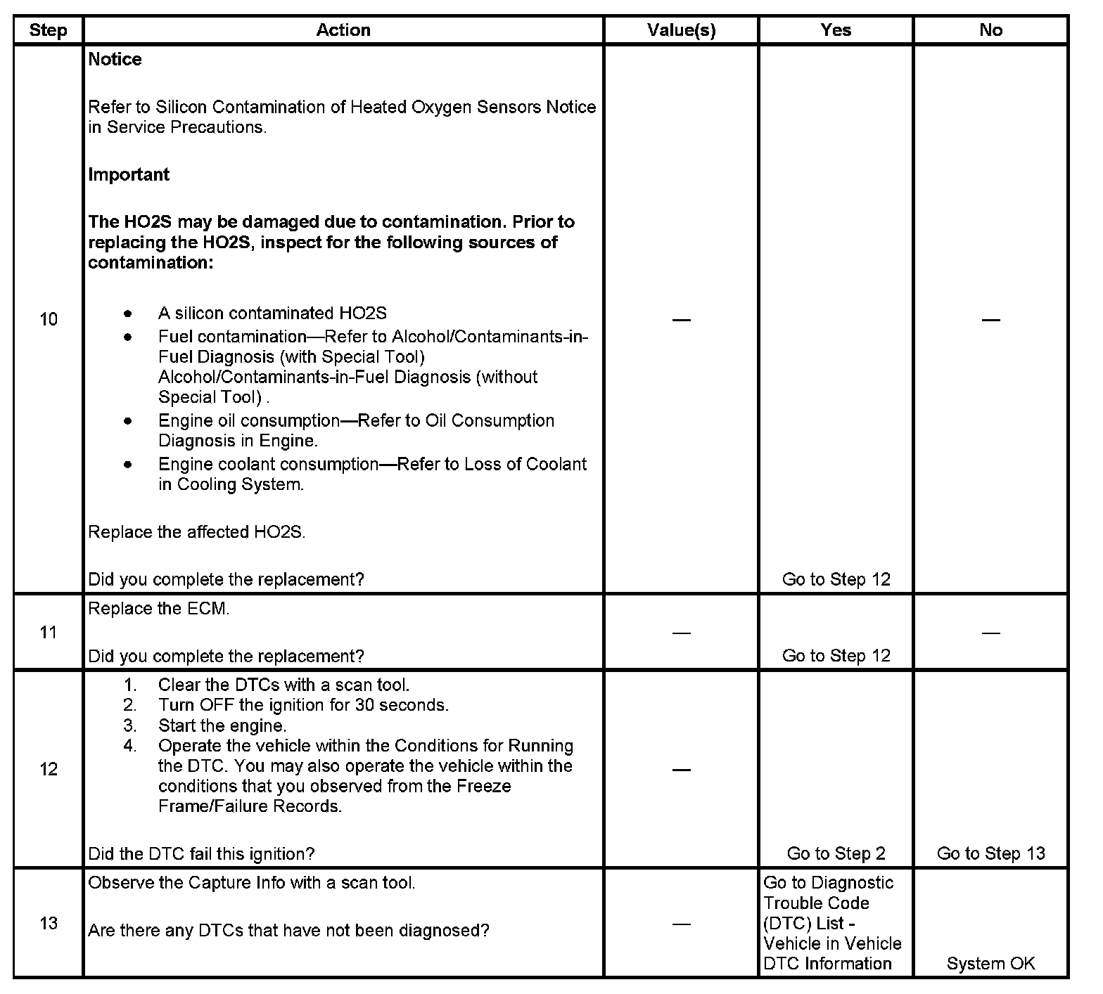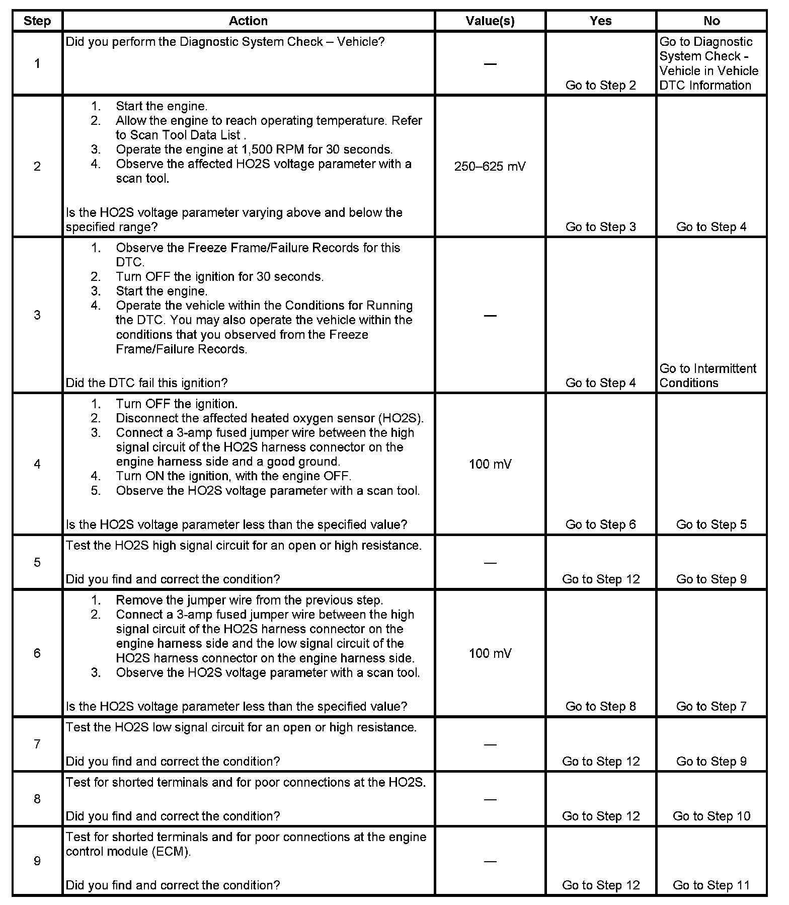 Heated oxygen sensors (HO2S) are used for fuel control and post catalyst monitoring. Each HO2S compares the oxygen content of the surrounding air with the oxygen content in the exhaust stream. The HO2S must reach operating temperature to provide an accurate voltage signal. Heating elements inside the HO2S minimize the time required for the sensors to reach operating temperature. The engine control module (ECM) supplies the HO2S with a reference, or bias, voltage of about 450 mV. When the engine is first started, the ECM operates in Open Loop, ignoring the HO2S voltage signal. Once the HO2S reaches operating temperature and Closed Loop is achieved, the HO2S generates a voltage within a range of 0-1,000 mV that fluctuates above and below bias voltage. High HO2S voltage indicates a rich exhaust stream. Low HO2S voltage indicates a lean exhaust stream. This diagnostic will only run once per ignition cycle. The ECM monitors the rich-to-lean and lean-to-rich transition time. A transition is defined as, the HO2S voltage changes from above 625 mV to below 250 mV or from below 250 mV to above 625 mV. If the ECM detects that the transition time is too long, DTC P0133 sets for HO2S bank 1 sensor 1, or DTC P0153 sets for HO2S bank 2 sensor 1.
