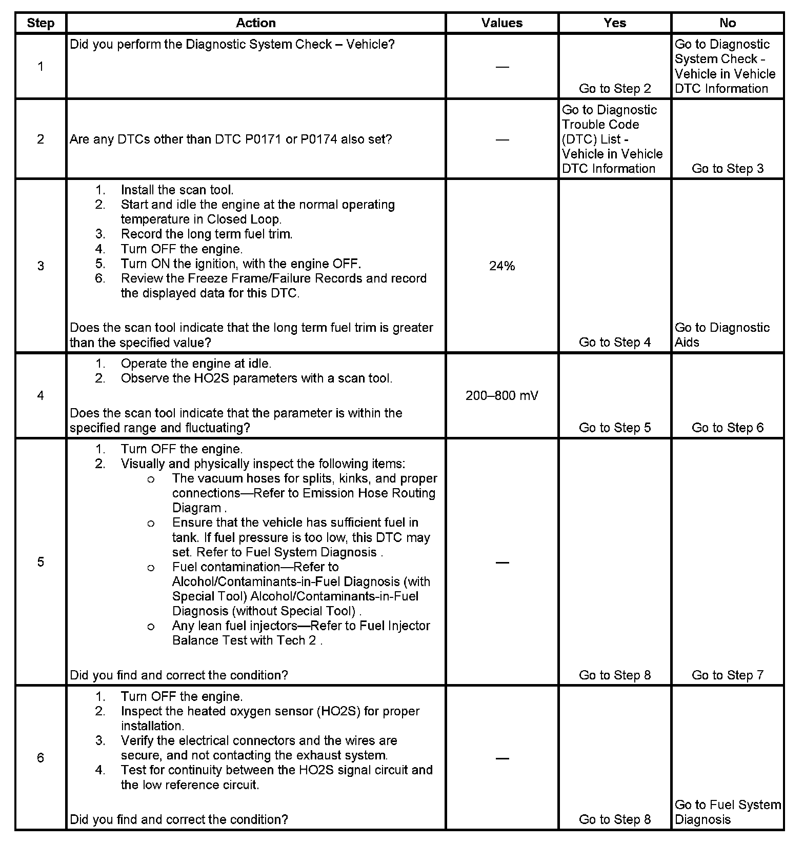 The engine control module (ECM) controls the air/fuel metering system in order to provide the best possible combination of driveability, fuel economy, and emission control. Fuel delivery is controlled differently during Open and Closed Loop. During Open Loop, the ECM determines fuel delivery based on sensor signals without heated oxygen sensor (HO2S) input. During Closed Loop, the HO2S inputs are added and used by the ECM to calculate short and long term fuel trim fuel delivery adjustments. If the HO2S indicates a lean condition, fuel trim values will be above 0 percent. If the HO2S indicate a rich condition, fuel trim values will be below 0 percent. Short term fuel trim values change rapidly in response to the HO2S voltage signals. Long term fuel trim makes coarse adjustments in order to maintain an air/fuel ratio of 14.7:1. If the ECM detects an excessively lean condition, DTC P0171 or P0174 sets.