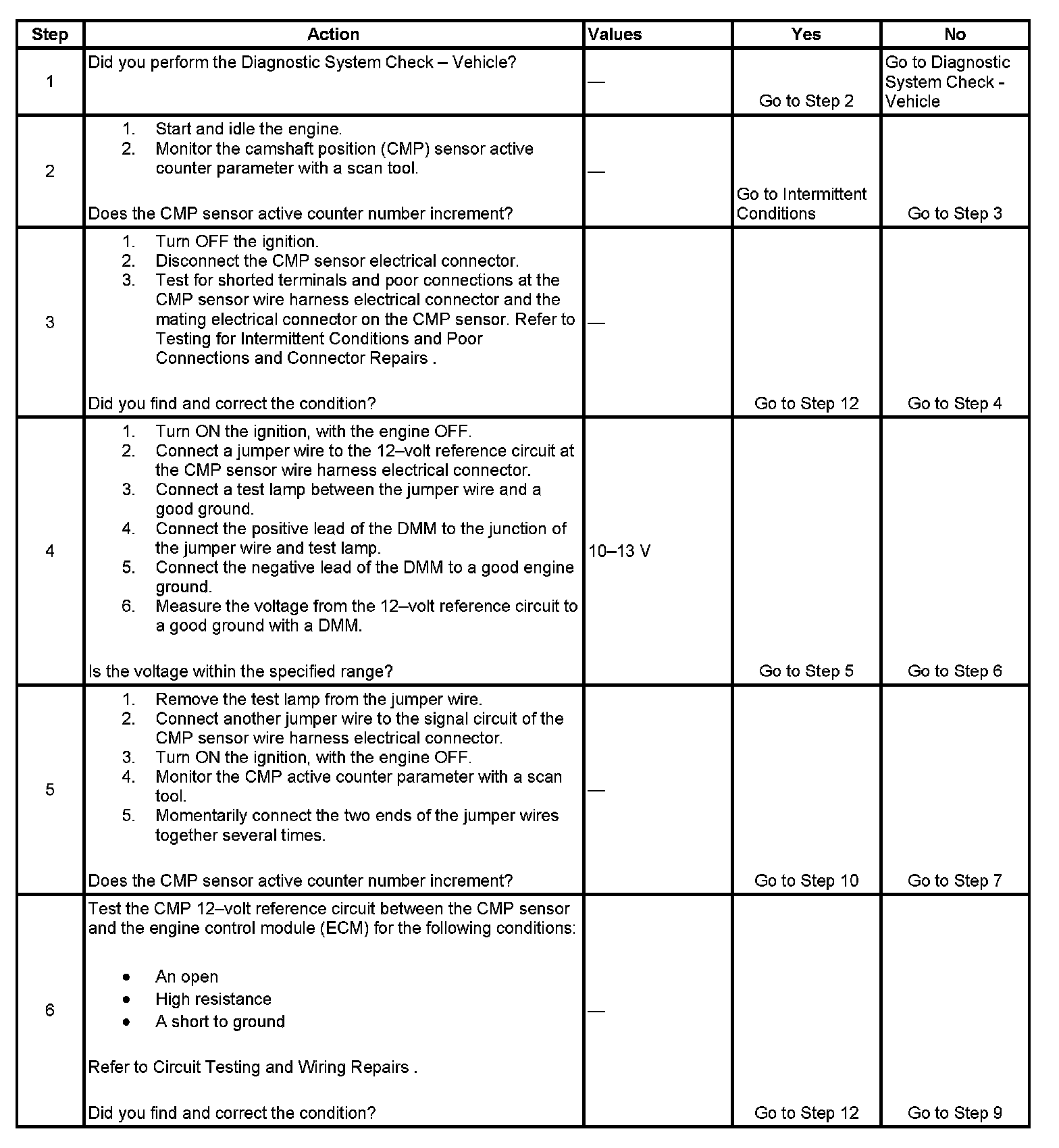 4. The test lamp in this step is used to apply a load to the 12-volt reference circuit of the CMP sensor.
