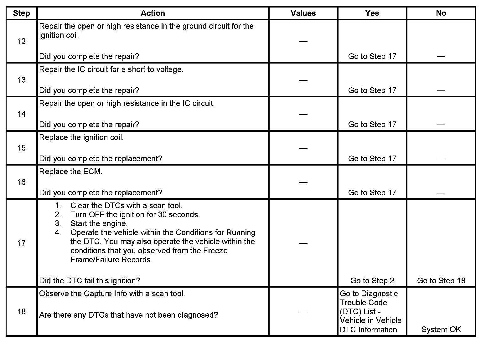 If the ECM detects that the IC circuit has an incorrect voltage level, DTC P0351-P0358 will set.