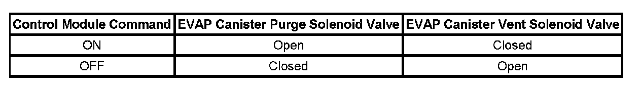 The table illustrates the relationship between the ON and OFF states, and the Open or Closed states of the EVAP canister purge and vent solenoid valves.