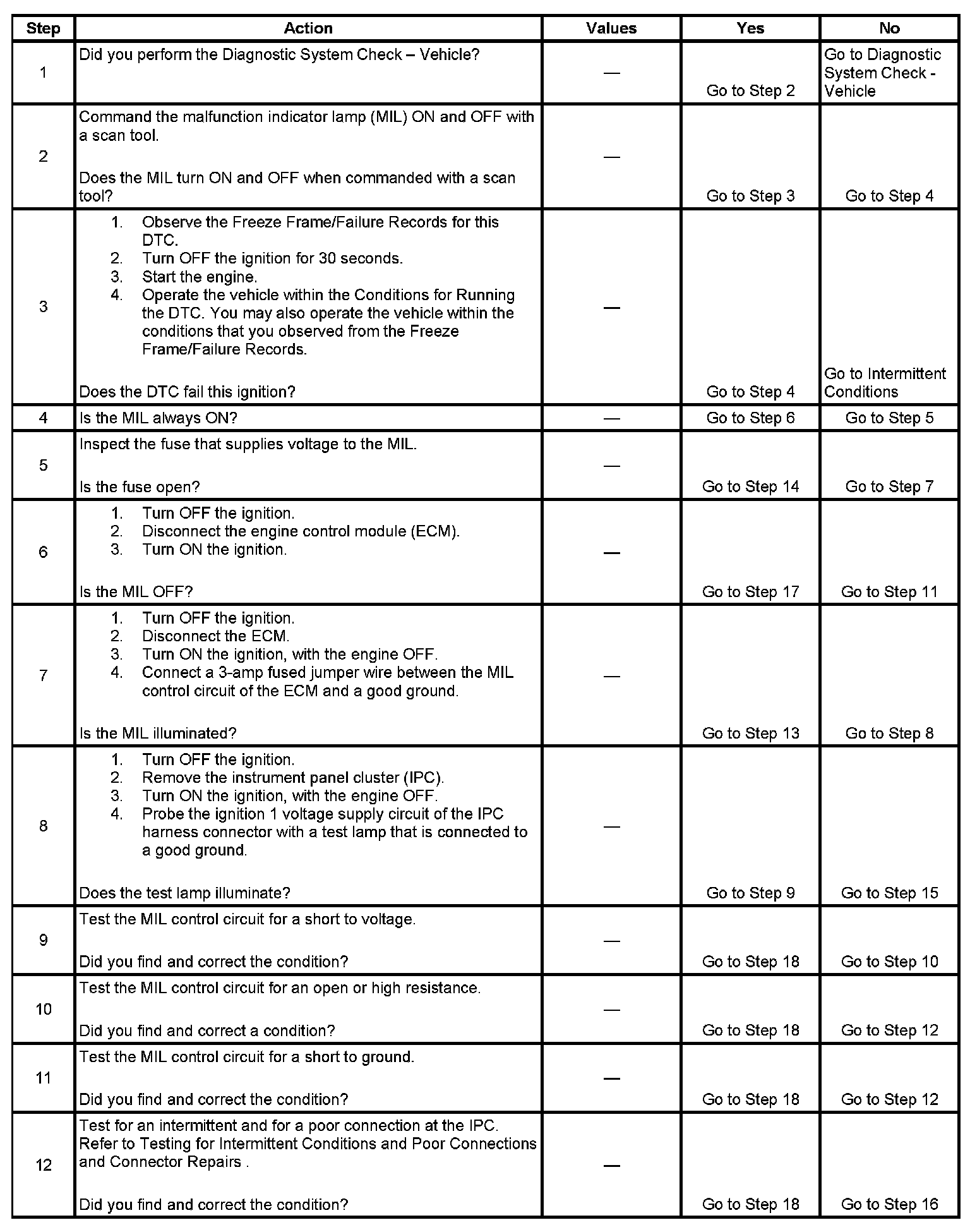 The malfunction indicator lamp (MIL) is located on the instrument panel cluster (IPC). The MIL informs the driver that an emission system fault has occurred and that the engine control system requires service. The control module monitors the MIL control circuit for conditions that are incorrect for the commanded state of the MIL. For example, a failure condition exists if the control module detects low voltage when the MIL is commanded OFF, or high voltage when the MIL is commanded ON. If the control module detects an improper voltage on the MIL control circuit, DTC P0650 will set.