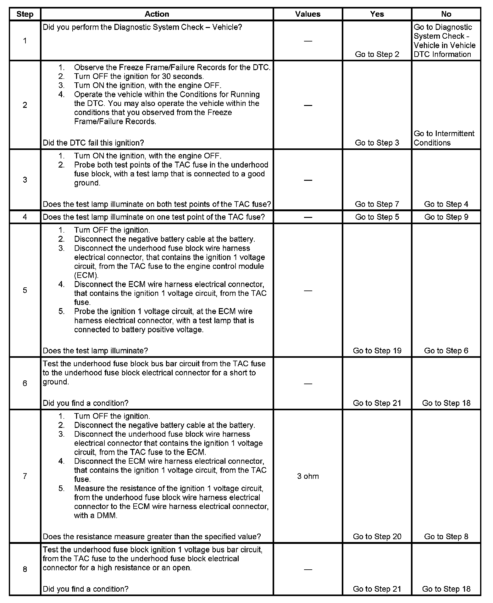 The ECM detects less than 10 volts on the TAC ignition 1 voltage circuit for 5 seconds.