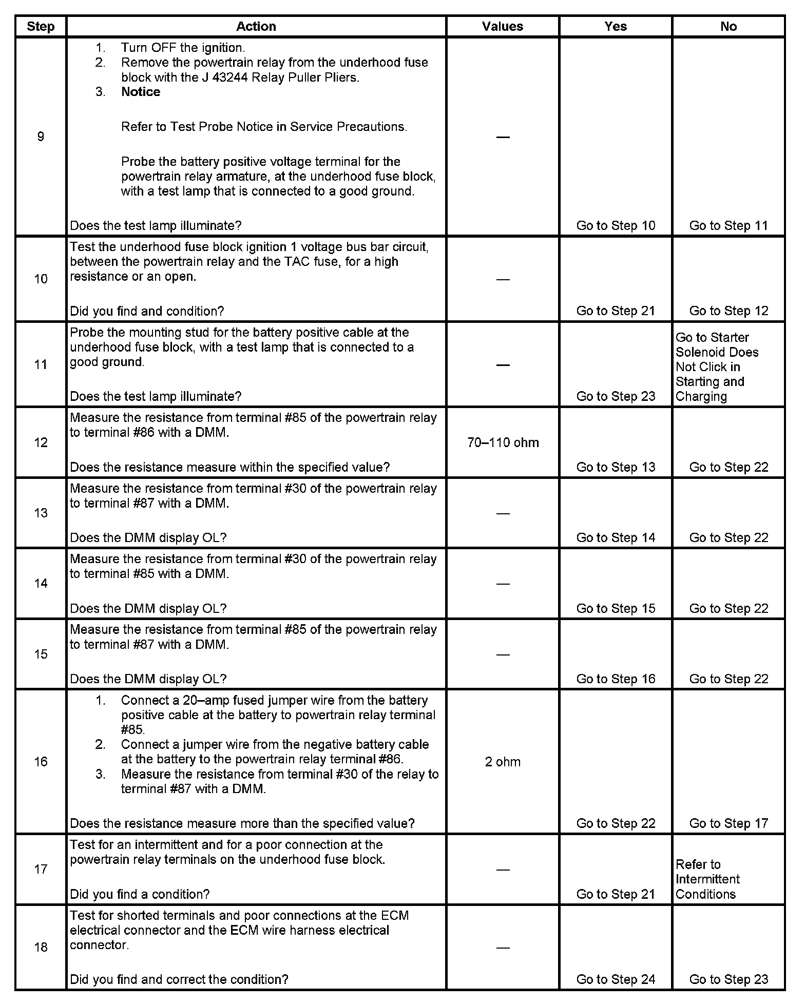 The powertrain relay is a normally open relay. The relay armature is held in the open position by spring tension. Battery positive voltage is supplied directly to the relay coil and the armature contact at all times. The engine control module (ECM) supplies the ground path to the relay coil control circuit via an internal integrated circuit called an output driver module (ODM). When the ECM commands the powertrain relay ON, ignition 1 voltage is supplied to the ECM through the TAC fuse in the underhood fuse block. This ignition 1 voltage input to the ECM provides the ignition power for the throttle actuator control (TAC) circuitry, and is also used to confirm the powertrain relay contacts have closed. This DTC will set when the ECM detects less than 10 volts on the ignition 1 voltage circuit to the ECM, after the ignition switch is turned ON. DTC P0689 indicates an open, high resistance, or short to ground in the ignition 1 voltage circuit to the ECM.