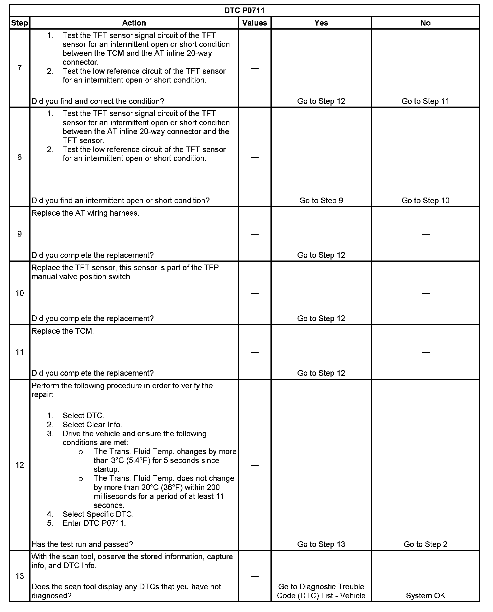 If the transmission control module (TCM) detects rapid or no voltage changes in the TFT sensor circuit, then DTC P0711 sets. DTC P0711 is a type C DTC.