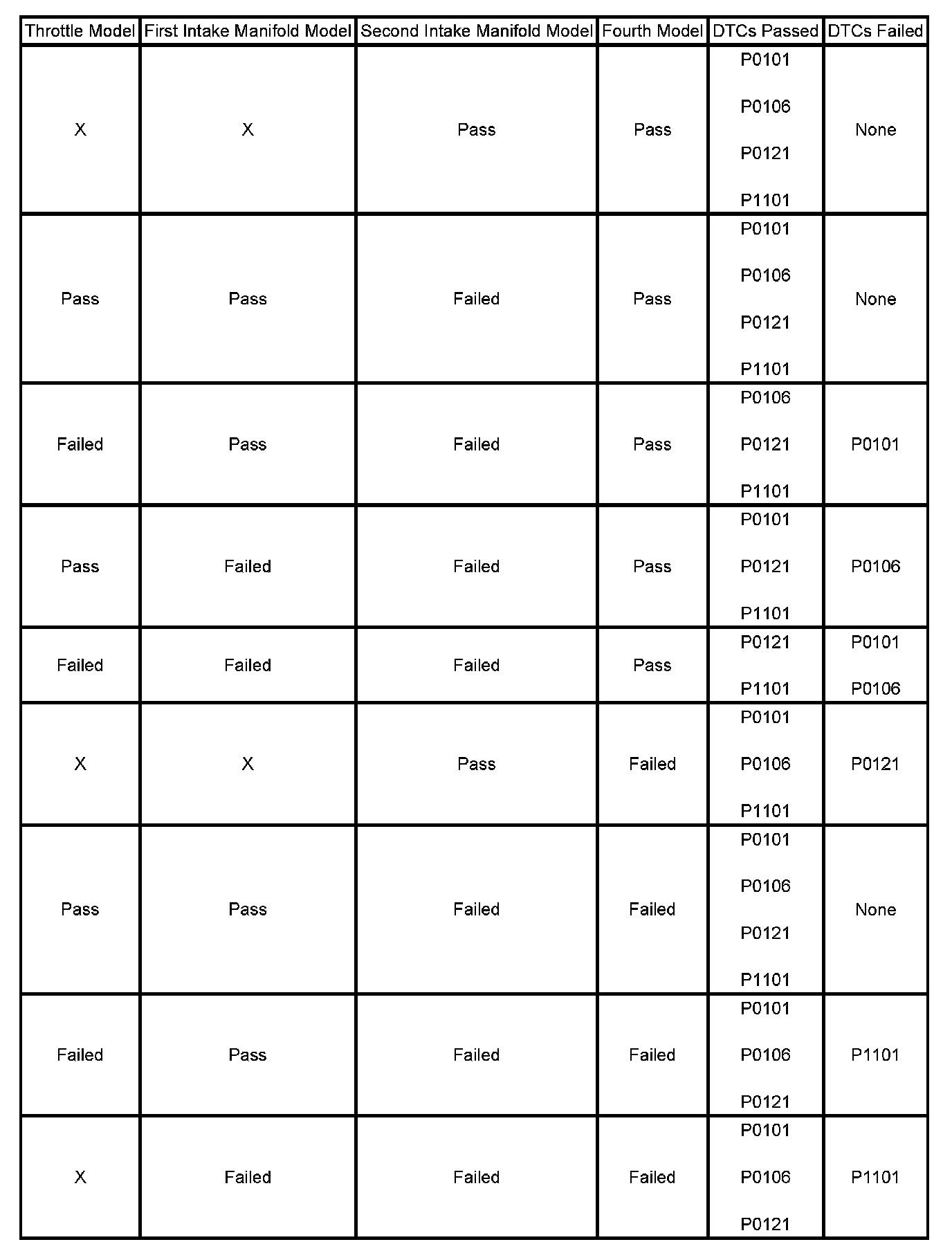 The estimates of MAF and MAP obtained from this system of models and calculations are then compared to the actual measured values from the MAF, MAP, and the TP sensors and to each other to determine the appropriate DTC to fail. The table illustrates the possible failure combinations and the resulting DTC or DTCs.