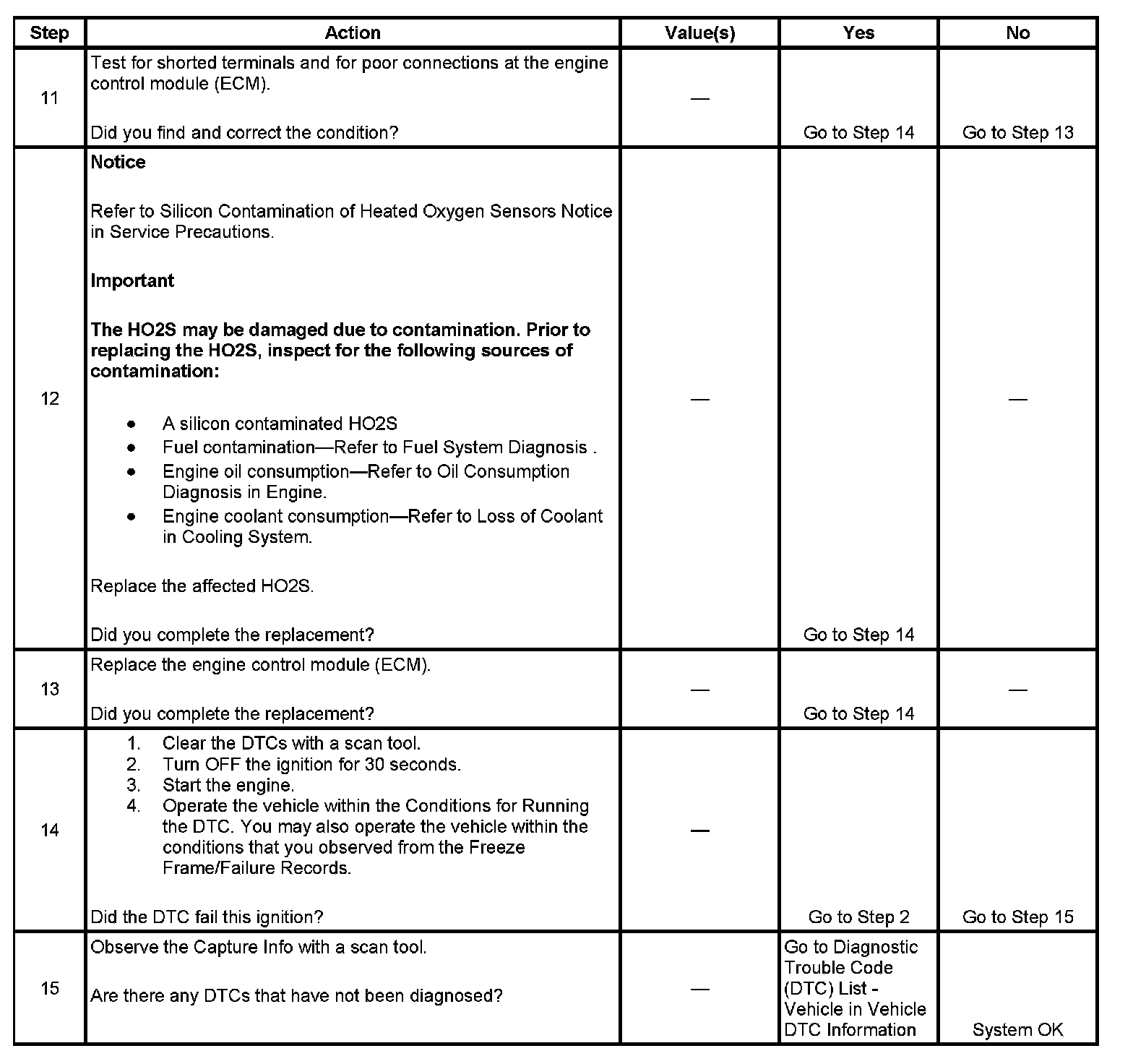 Heated oxygen sensors (HO2S) are used for fuel control and post catalyst monitoring. Each HO2S compares the oxygen content of the surrounding air with the oxygen content in the exhaust stream. The HO2S must reach operating temperature to provide an accurate voltage signal. Heating elements inside the HO2S minimize the time required for the sensors to reach operating temperature. The engine control module (ECM) supplies the HO2S with a reference, or bias, voltage of about 450 mV. When the engine is first started the ECM operates in Open Loop, ignoring the HO2S voltage signal. Once the HO2S reaches operating temperature and Closed Loop is achieved, the HO2S generates a voltage within a range of 0-1,000 mV that fluctuates above and below bias voltage. High HO2S voltage indicates a rich exhaust stream. Low HO2S voltage indicates a lean exhaust stream. This diagnostic will only run once per ignition cycle. The ECM monitors the number of rich-to-lean and lean-to-rich transitions. If the ECM detects that the number of transitions were less than a specified value, DTC P1133 sets for HO2S bank 1 sensor 1, or DTC P1153 sets for HO2S bank 2 sensor 1.