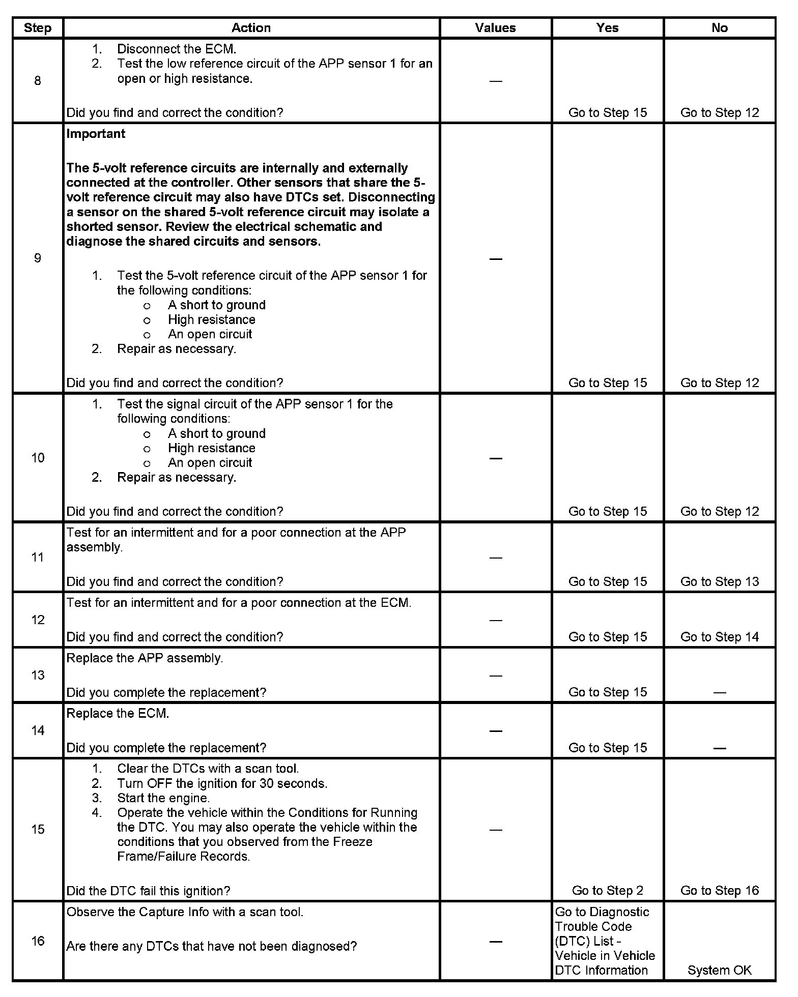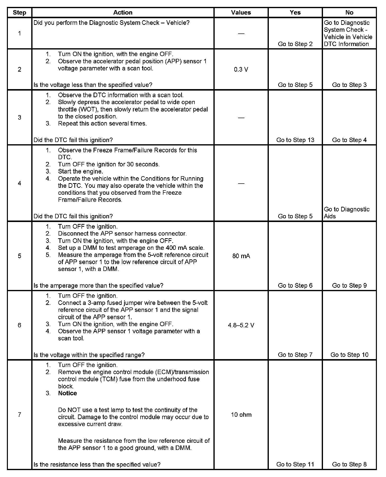 3. This step tests the internal circuits of the APP sensor 1 throughout its range of motion. If this DTC sets when slowly moving the pedal from the rest position to wide open throttle (WOT), replace the APP assembly for an internal fault.